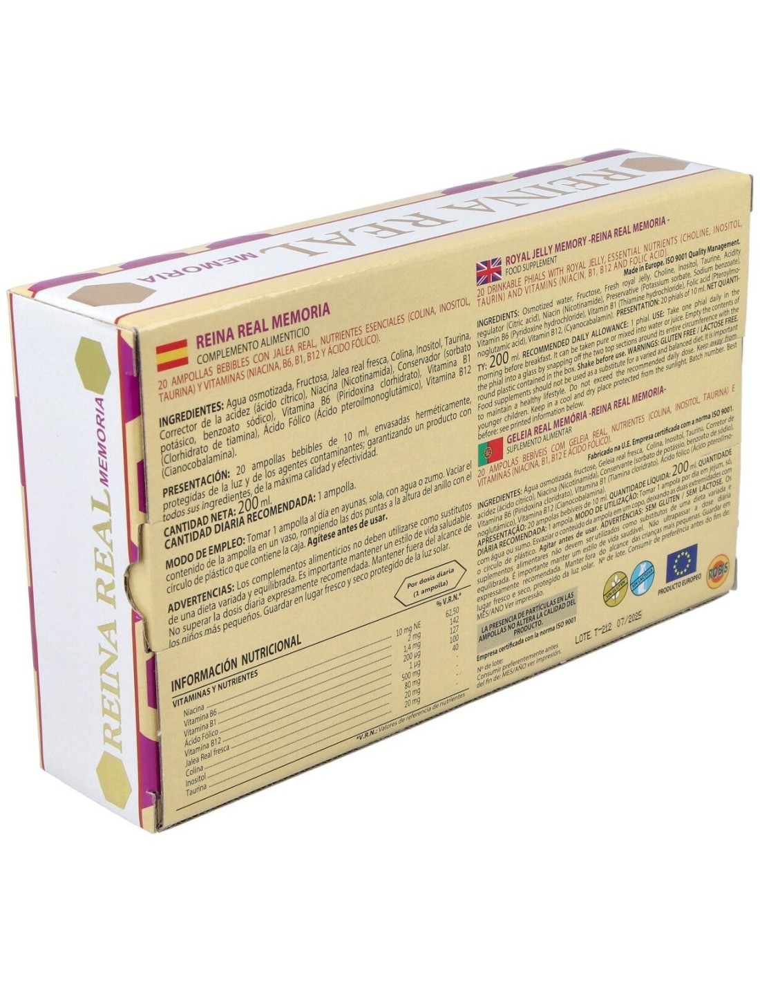 Jalea real fresca, Colina, Inositol, Taurina, Vitaminas: B1 (clorhidrato de tiamina), B3 (nicotinamida), B6 (clorhidrato de piridoxina) y B12 (cianocobalamina); Folato (ácido pteroilmonoglutámico), fructosa, conservador (sorbato potásico, benzoato sódico), corrector de la acidez (ácido cítrico) y agua purificada.