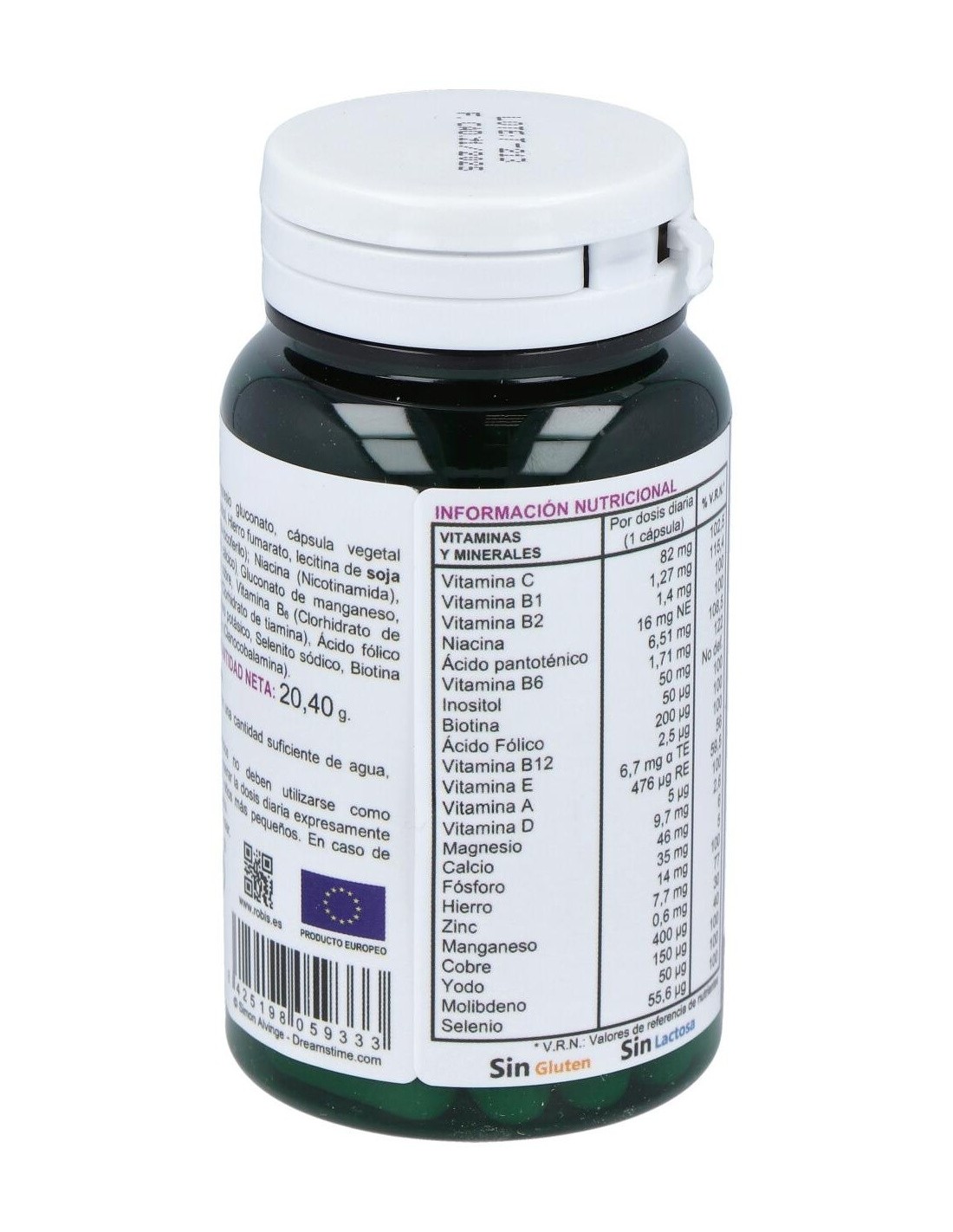lecitina de soja NO GMO. Envolvente: Gelatina, glicerina, óxido de hierro.