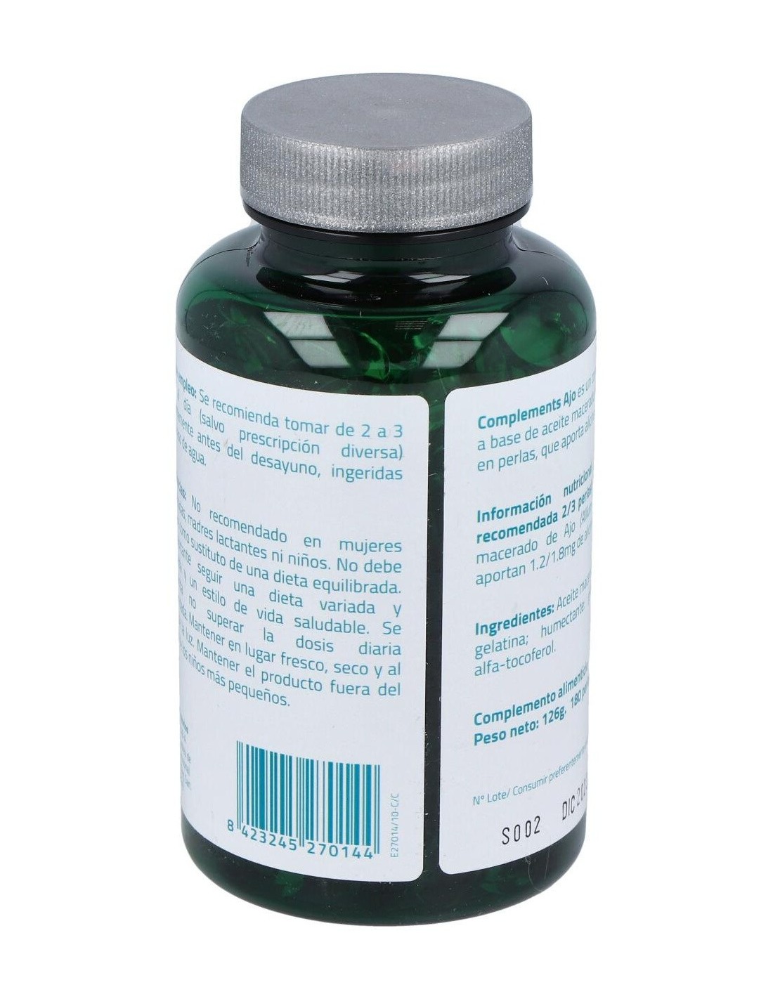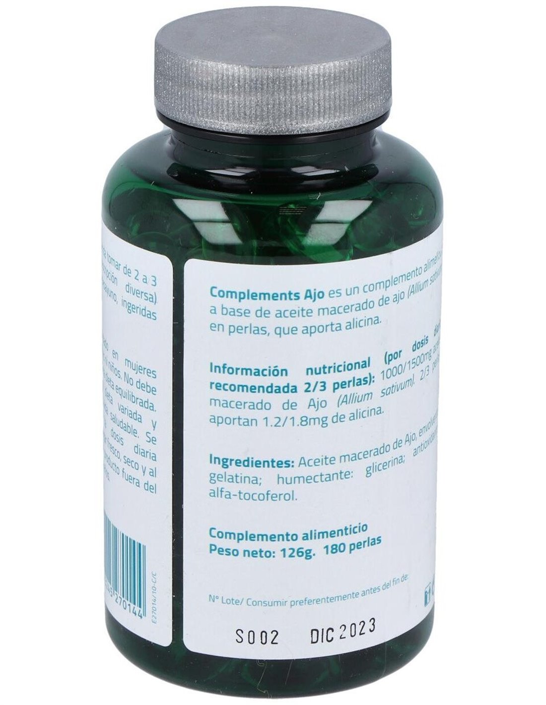 Aceite macerado de ajo, envolvente: gelatina, humectante: glicerina.
