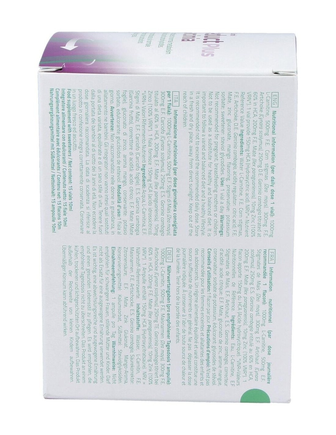 1000 mg L-Carnitina, 500 mg E.F. Estigmas de Maíz (Zea mays), 300 mg E.F. Alcachofa (Cynara scolymus), 250 mg E.S. Garcinia cambogia titulado al 60% en HCA, 200 mg E.F. Hierba Mate (llex paraguariensis), 10 mg Zinc (100% VRN). 1 vial aporta 150 mg de HCA (Ácido hidroxicítrico).