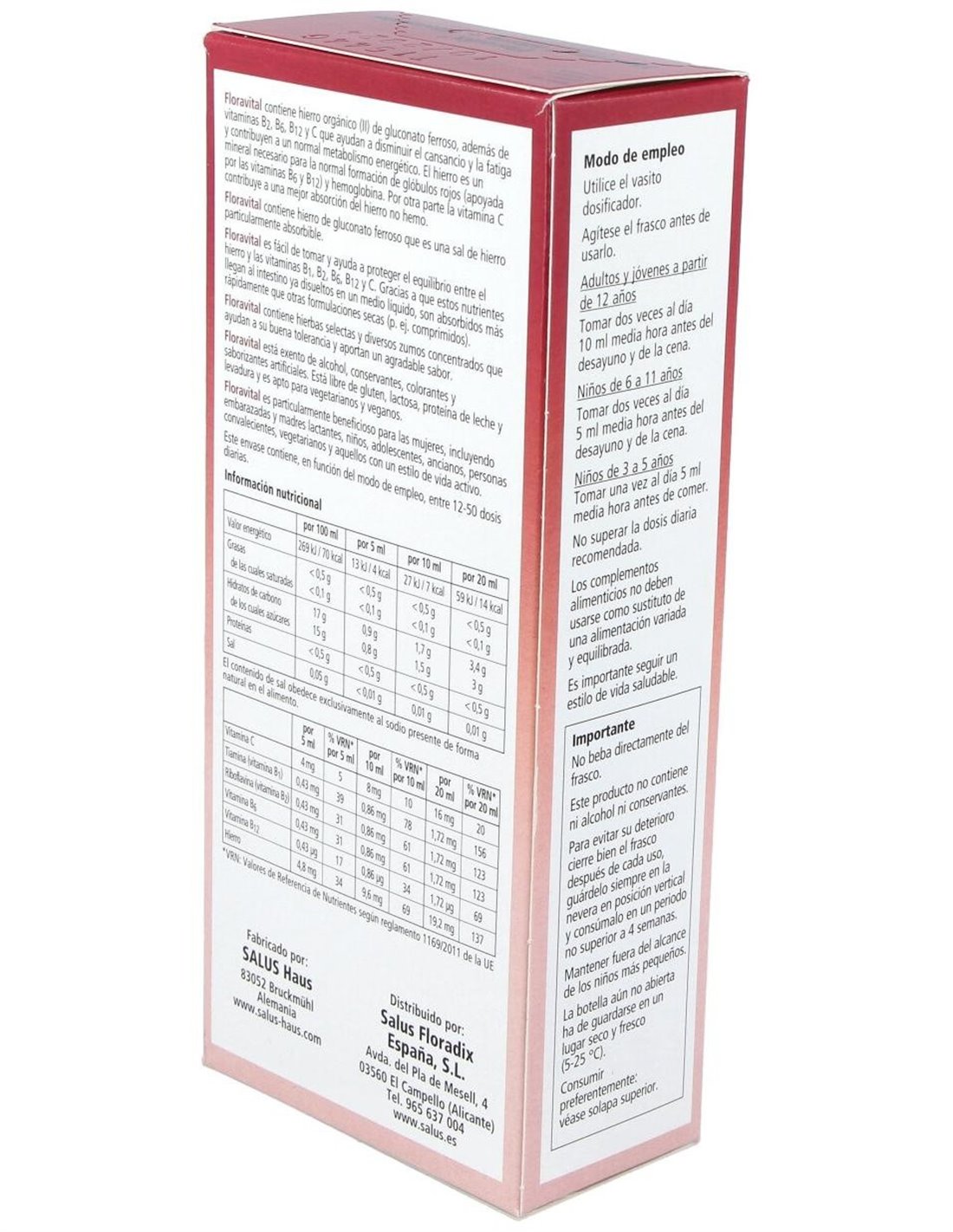 Floravital es un tónico muy similar a Floradix y con la misma finalidad, aportar al organismo hierro nutricional. Sin embargo, ha sido especialmente concebido para los colectivos que no pueden tomar Floradix por ser intolerantes a alguno de sus ingredientes. Contiene hierro orgánico, además de vitaminas B2, B6, B12 y C que ayudan a disminuir el cansancio y la fatiga y contribuyen a un normal metabolismo energético. Es particularmente beneficioso para las mujeres (incluyendo embarazadas y madres lactantes) niños, adolescentes, ancianos, personas convalecientes, vegetarianos y personas con un estilo de vida activo.