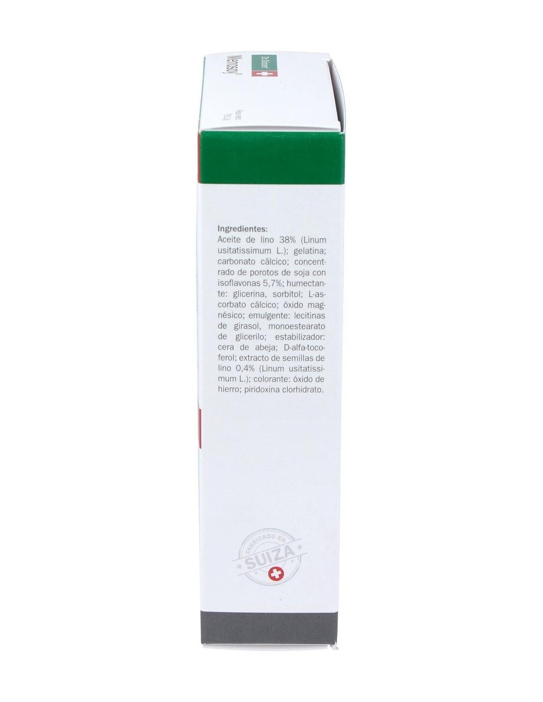 Aceite de lino 38 % (Linum usitatissimum L.), gelatina, carbonato cálcico, concentrado de porotos de soja con isoflavonas 5,7 %, humectantes (glicerina, sorbitol), L-ascorbato cálcico, óxido magnésico, emulgentes (lecitinas de girasol, monoestearato de glicerilo), estabilizador (cera de abeja), D-alfa-tocoferol, extracto de semillas de lino 0,4 % (Linum usitatissimum L.), colorante (óxido de hierro), piridoxina clorhidrato.