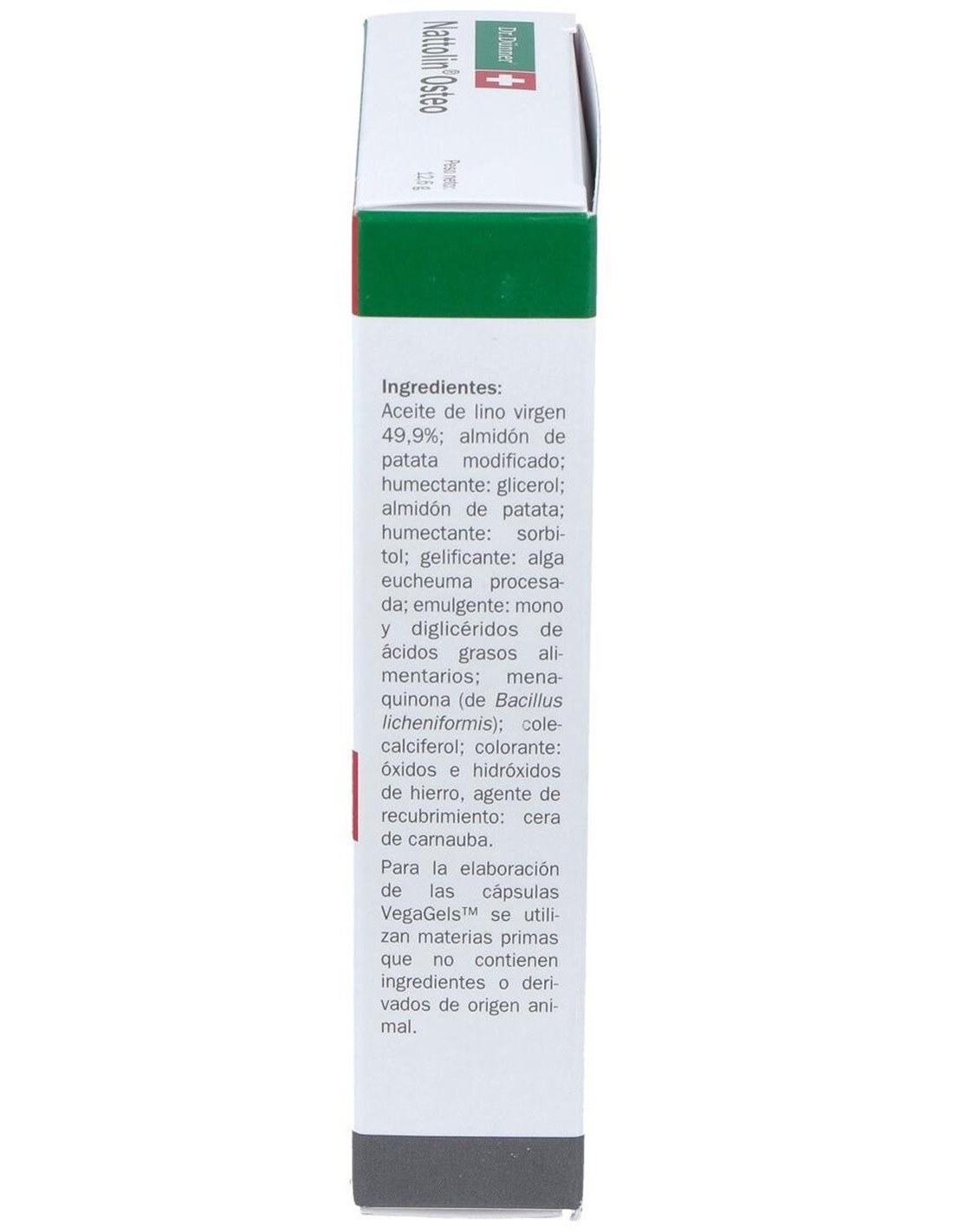 ACEITE DE LINO NATIVO (49,9%); ALMIDÓN DE PATATA MODIFICADO; HUMECTANTES: SORBITOL, MALTITOL, GLICEROL; MENAQUINONA; EMULGENTE: MONO Y DIGLICÉRIDOS DE ÁCIDOS GRASOS, ALMIDÓN DE PATATA, ALMIDÓN DE PATATA, COLECALCIFEROL; COLORANTE: ÓXIDOS E HIDRÓXIDOS DE HIERRO; AGENTE DE RECUBRIMIENTO: CERA DE CARNAÚBA.