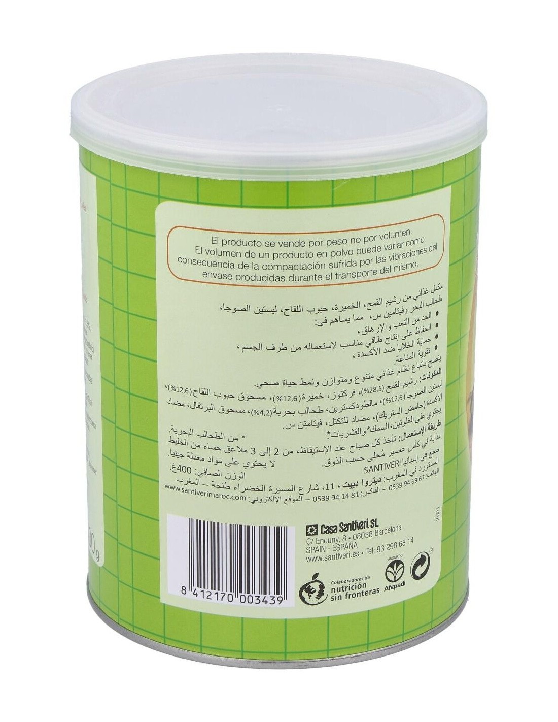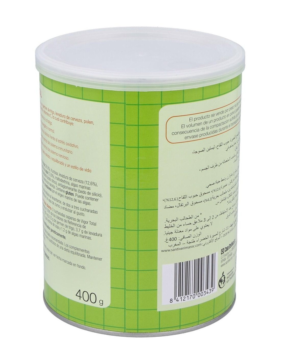 Santiveri Vigor Total + 400g es un suplemento alimenticio a base de levadura de cerveza, polem, germen de trigo, maca, lectina de soja, vitamina C y algas kelp. Ayuda a energizar el cuerpo.