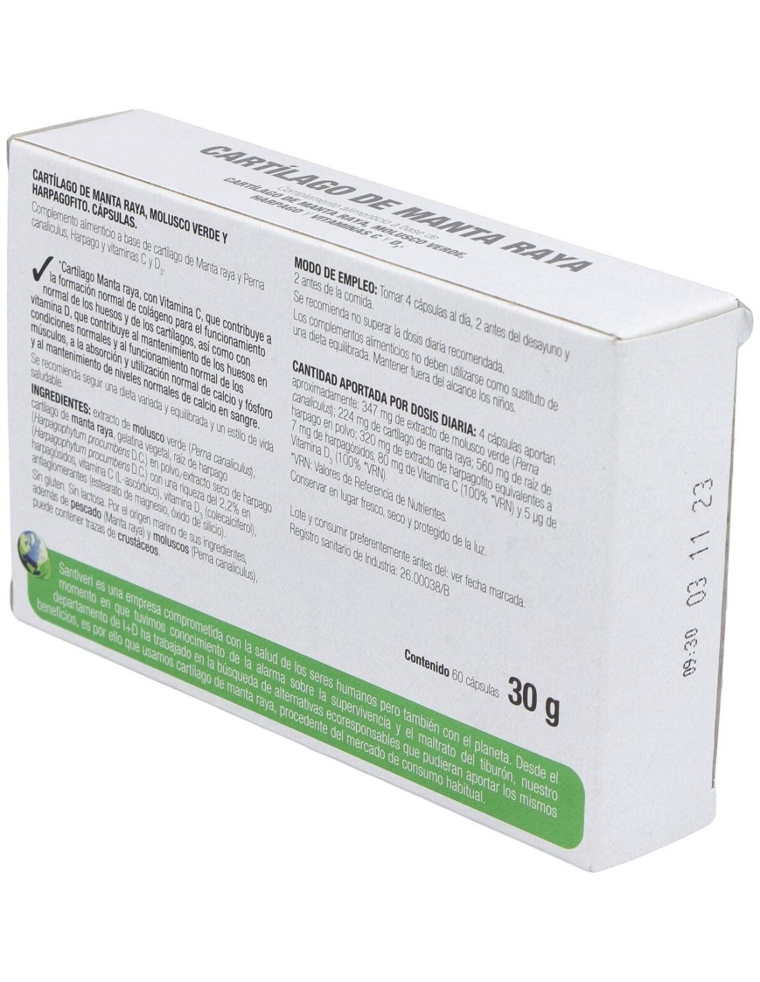 Complemento alimenticio con cartílago de manta raya con vitamina D y Vitamina C que contribuye a la formación normal de colágeno para el adecuado funcionamiento de huesos y cartílagos.