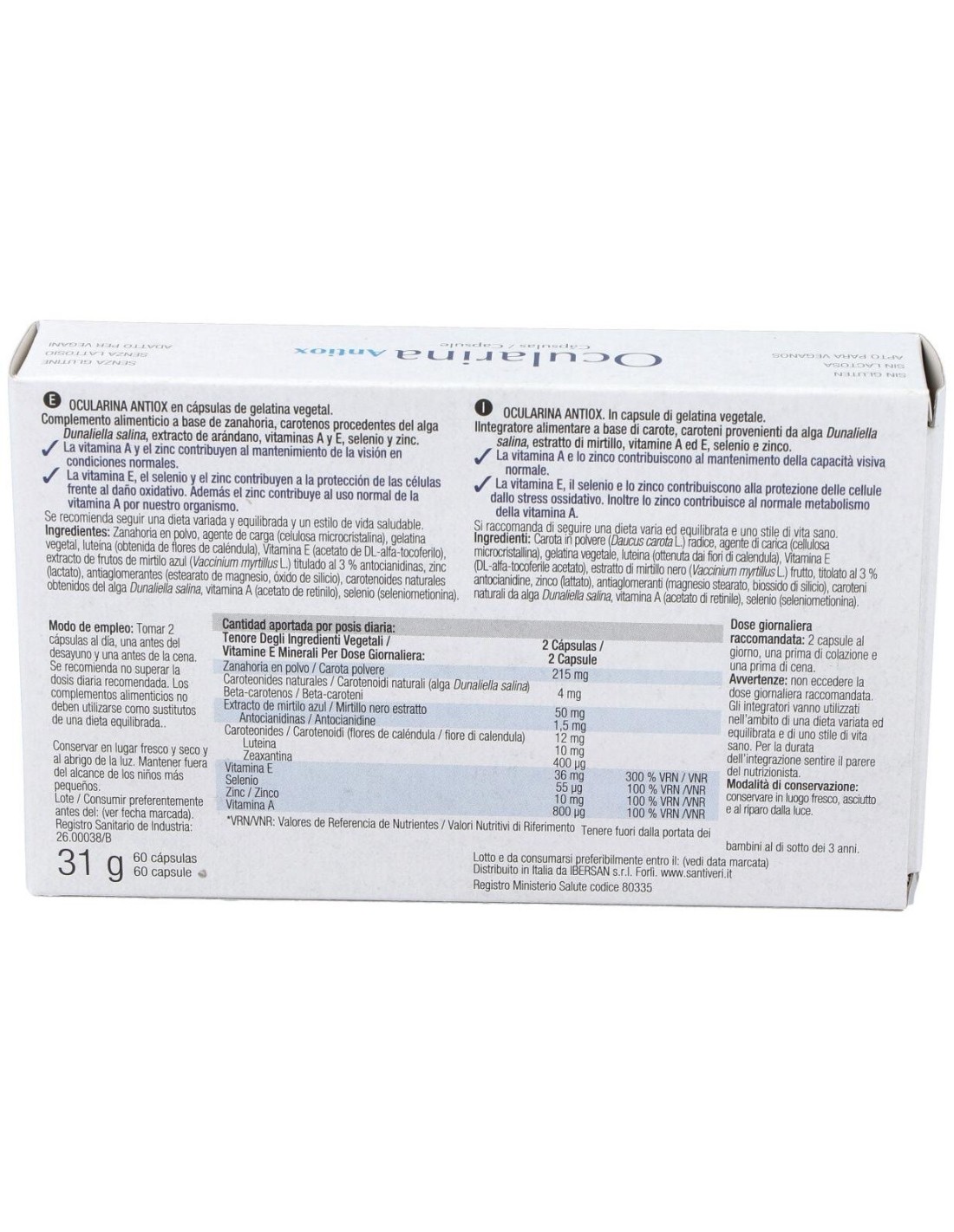 Zanahoria en polvo, agente de carga (celulosa microcristalina), gelatina vegetal, luteína (obtenida de flores de caléndula), vitamina E (acetato de DL-alfa-tocoferilo), extracto de frutos de mirtilo azul (Vaccinium myrtillus L) titulado al 3% antocianidinas, zinc (lactato), antiaglomerantes (estearato de magnesio, óxido de silicio), carotenoides naturales obtenidos del alga Dunaliella salina, vitamina A (acetato de retinilo), selenio (seleniometionina).
