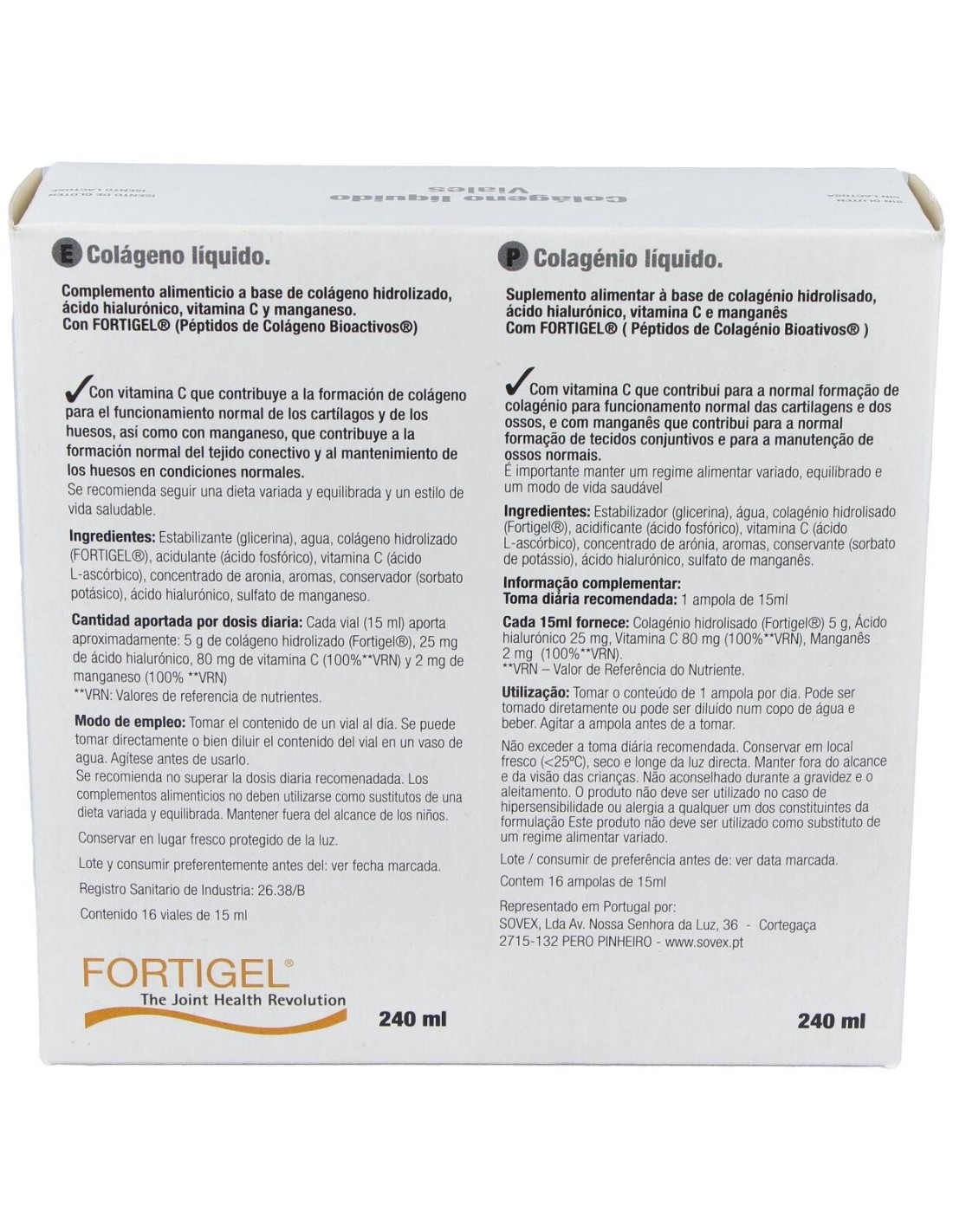 Estabilizante (glicerina), agua, colágeno hidrolizado (FORTIGEL®) (27,8%), acidulante (ácido fosfórico), vitamina C (ácido L-ascórbico), concentrado de aronia, aroma, conservador (sorbato potásico), ácido hialurónico (0,15%), sulfato de manganeso, edulcorante (sucralosa).