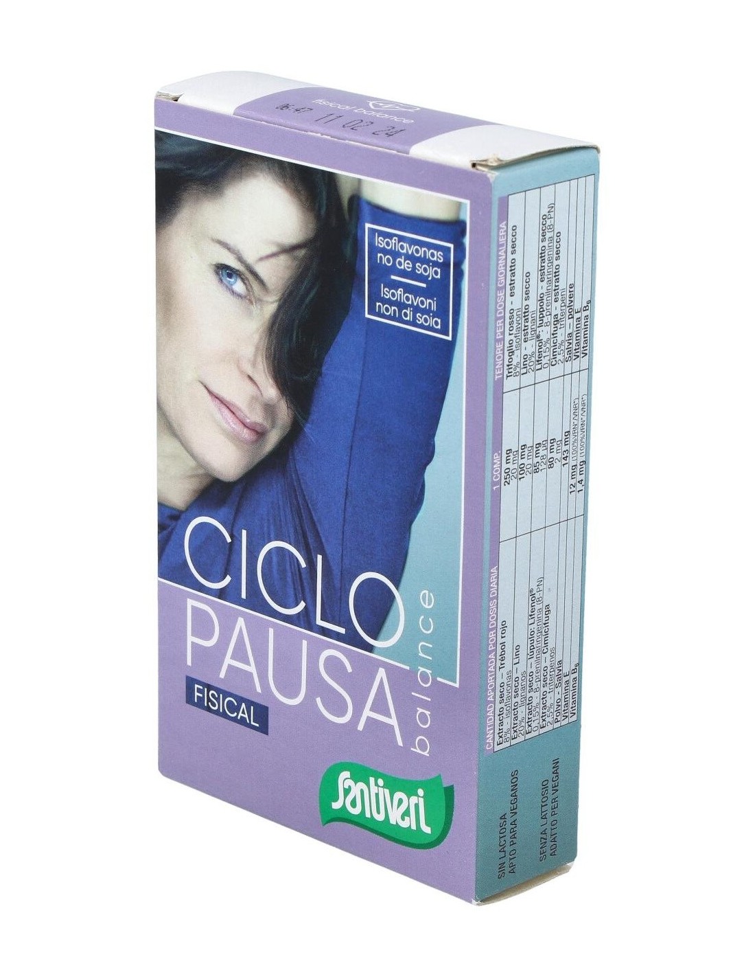 250 mg de extracto seco de trébol rojo, titulado al 8% en isoflavonas (20 mg): 100 mg de extracto seco de lino, titulado al 20% en lignanos (20 mg): 85 mg de extracto seco de lúpulo Lifenol®, titulado al 20% en lignanos (128 µg): 80 mg de extracto seco de cimicífuga, titulado al 2,5% en triterpenos (2 mg): 143 mg de Salvia, polvo: 12 mg de vitamina E: 1,4 mg de vitamina B6