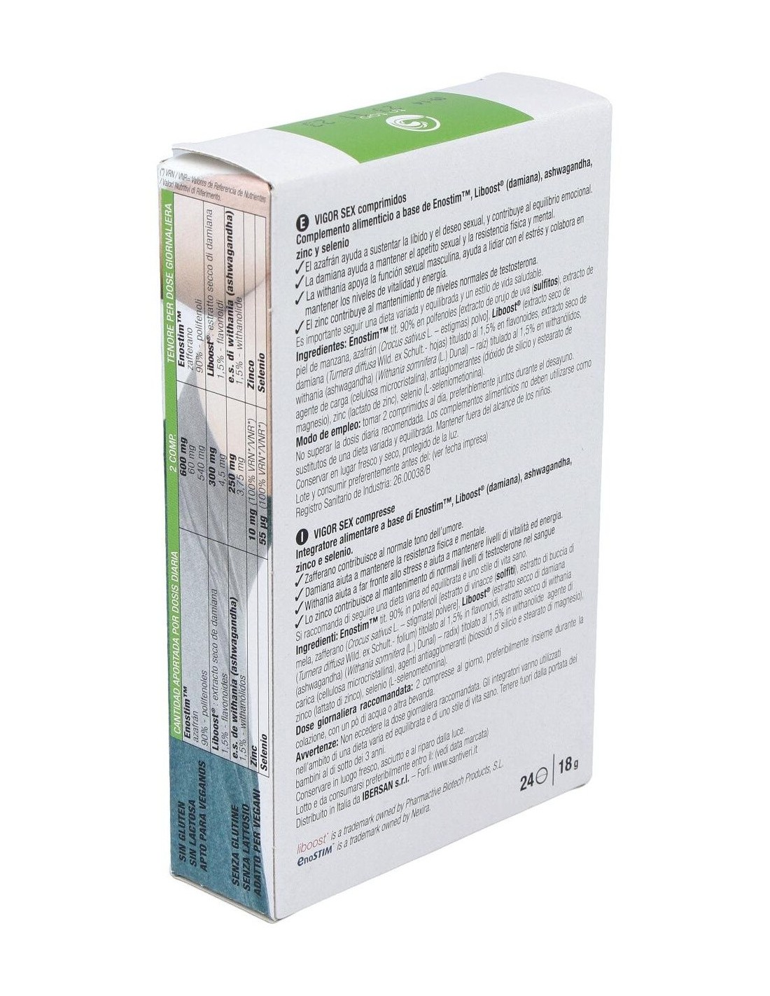 Santiveri Vigor Sex 24Comp es un complemento alimenticio a base de Enostim, Liboost® (damiana), ashwagandha, zinc y selenio que ayuda a sustentar la libido y el deseo sexual.Ayuda a estimular la líbido y el deseo sexual.