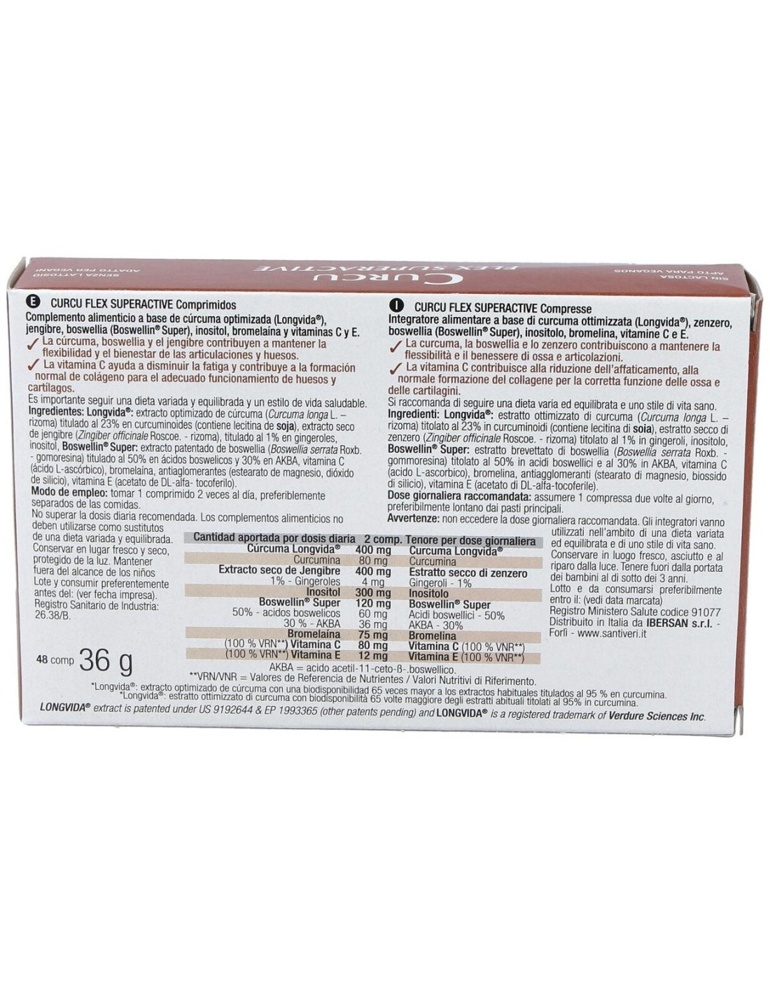 Longvida®: extracto optimizado de cúrcuma (Curcuma longa L. : rizoma) titulado al 23% en curcuminoides (contiene lecitina de soja), extracto seco de jengibre (Zingiber officinale Roscoe. - rizoma), titulado al 1% en gingeroles, inositol, Boswellin® Super: extracto patentado de Boswellia (Boswellia serrata Roxb. - gomoresina) titulado al 50% en ácidos boswelicos y 30% en AKBA, vitamina C ácido (L-ascórbico), bromelaína, antiaglomerantes (estearato de magnesio, dióxido de silicio), vitamina E (acetato de DL-alfa-tocoferilo).Longvida®: extracto optimizado de cúrcuma con una biodisponibilidad 65 veces mayor a los extractos habituales titulados al 95% en curcumina.