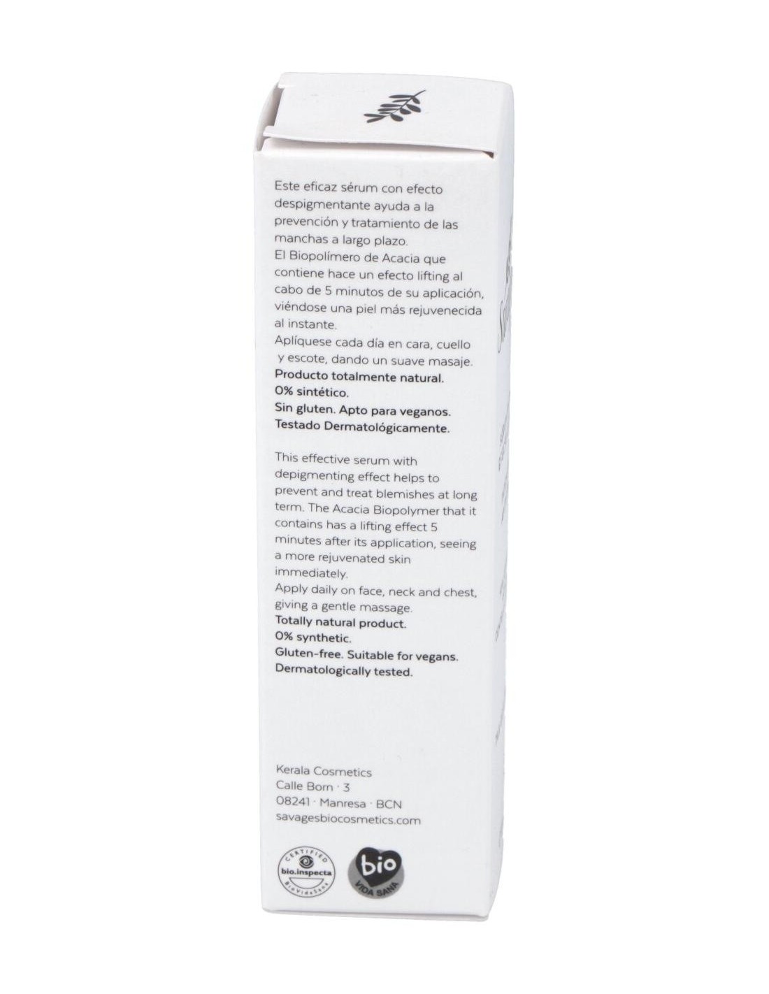 Es un sérum con efecto despigmentante ayuda a la prevención y tratamiento de las manchas a largo plazo, gracias a activos como el Extracto de Margarita, el Agua Celular de Mandarina y el Ácido Fítico. El Biopolímero de Acacia que contiene, hace un efecto lifting al cabo de 5 minutos de la aplicación, contribuye a de conseguir la piel más rejuvenecida al instante.