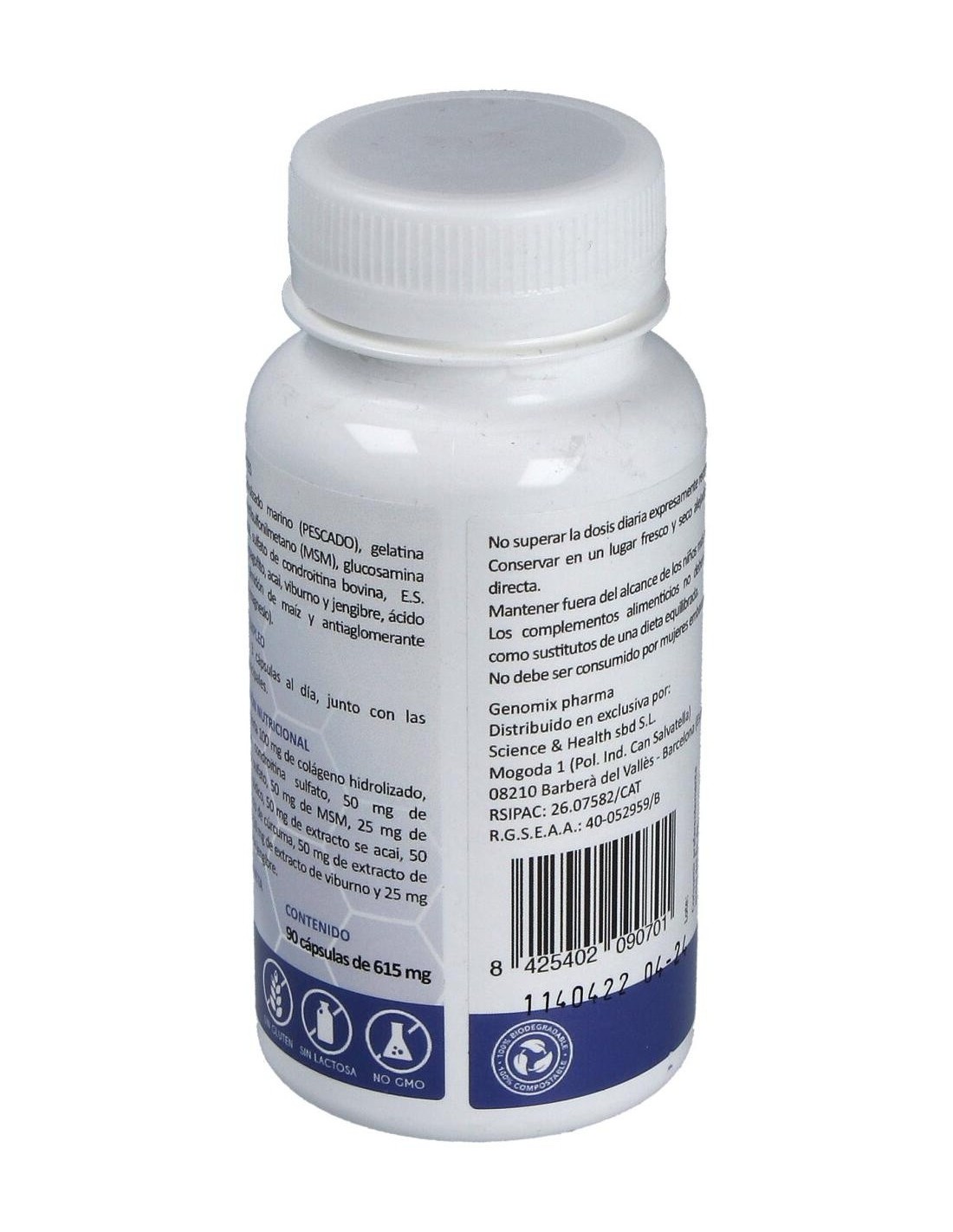 Complemento alimenticio en forma de cápsulas, elaborado a base de condroitina, glucosamina, MSM, colágeno hidrolizado, hialuronato sódico y extractos naturales, que contribuye a mejorar la salud y movilidad de las articulaciones.