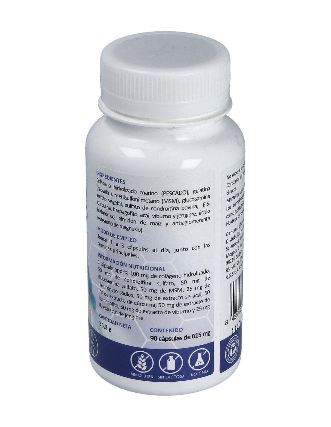 Por 1 cápsula: 100 mg de colágeno hidrolizado, 5 mg de condroitina sulfato, 50 mg de glucosamina sulfato, 50 mg de MSM, 25 mg de hialuronato sódico, 50 mg de extracto de açai, 50 mg de extracto de cúrcuma, 50 mg de extracto de harpagofito, 50 mg de extracto de viburno, 25 mg de extracto de jengibre.