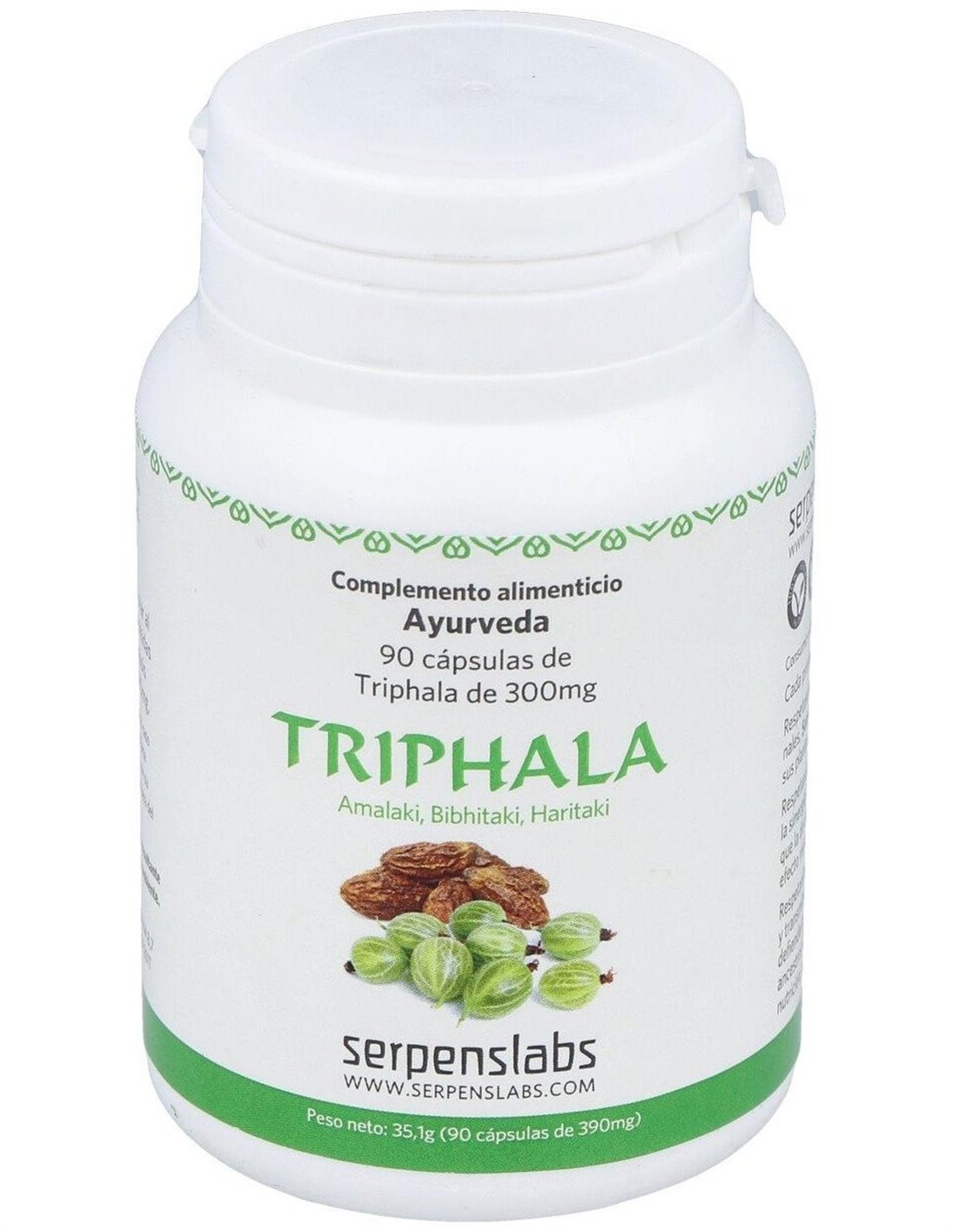 SERPENSComplemento alimenticio a base de Triphala con certificación ecológica. Extracto natural de Triphala, caracteriza por ser considerado un limpiador intestinal eficaz y seguro, ya que fomenta una desintoxicación natural y suave, ayudando al cuerpo a eliminar las toxinas, por lo mismo recibe las cualidades de tónico y rejuvenecedor.