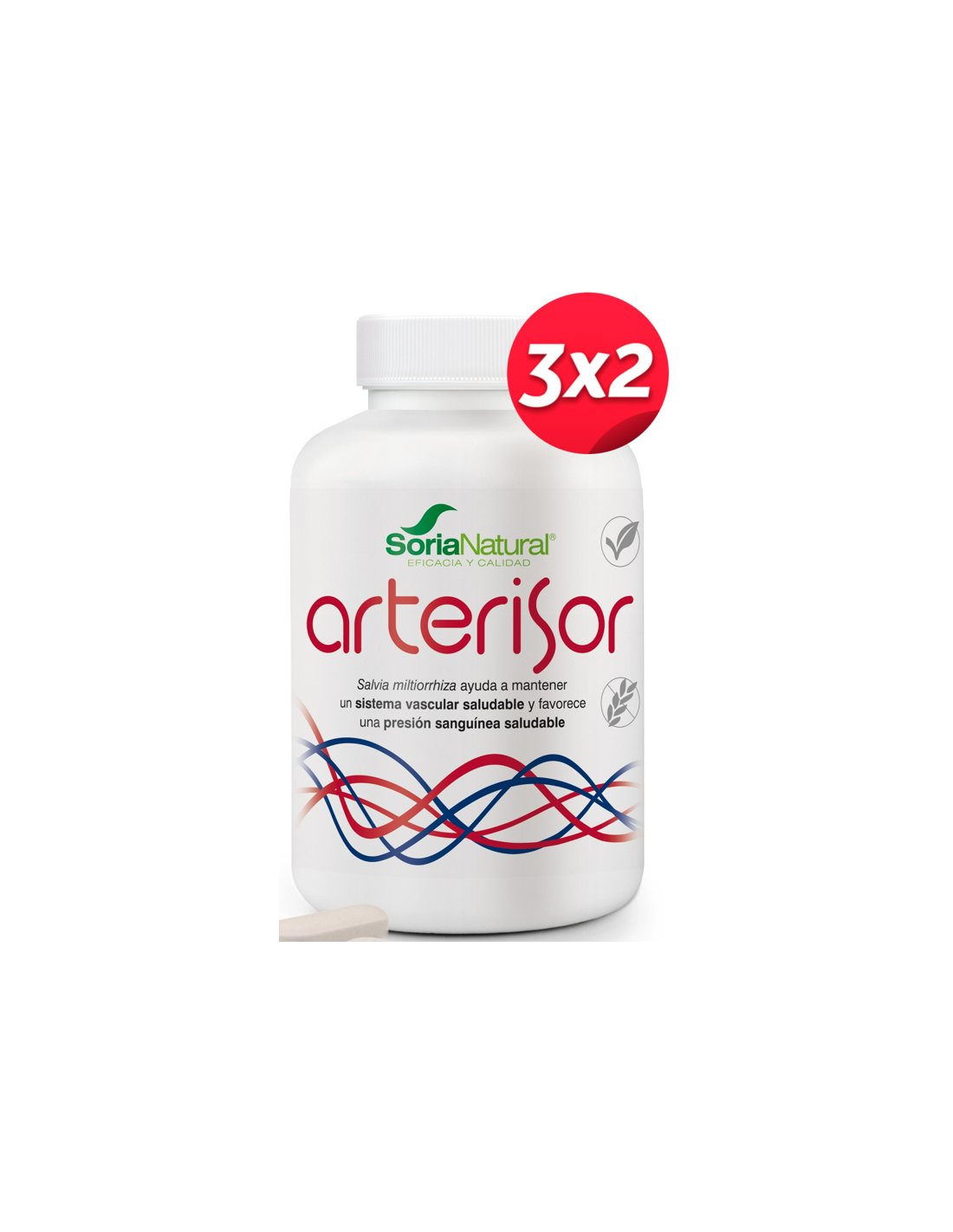 SORIA NATURAL 3X2Arterisor es un producto que asocia plantas medicinales (Salvia miltiorrhiza, Aronia melanocarpa y el alga Monostroma nitidum) que tienen la ventaja de actuar de forma sinérgica sobre los principales factores de riesgo (dislipemias, hipertensión arterial, diabetes, obesidad, etc.) de las enfermedades cardiovasculares (angina de pecho, infarto de miocardio, ictus cerebrales por trombosis O y hemorragias y enfermedad arterial periférica) y sobre los mecanismos celulares y moleculares relacionados con el desarrollo y evolución de la aterosclerosis, lo que nos puede proporcionar un mayor beneficio