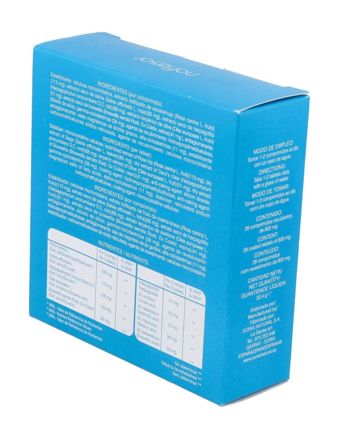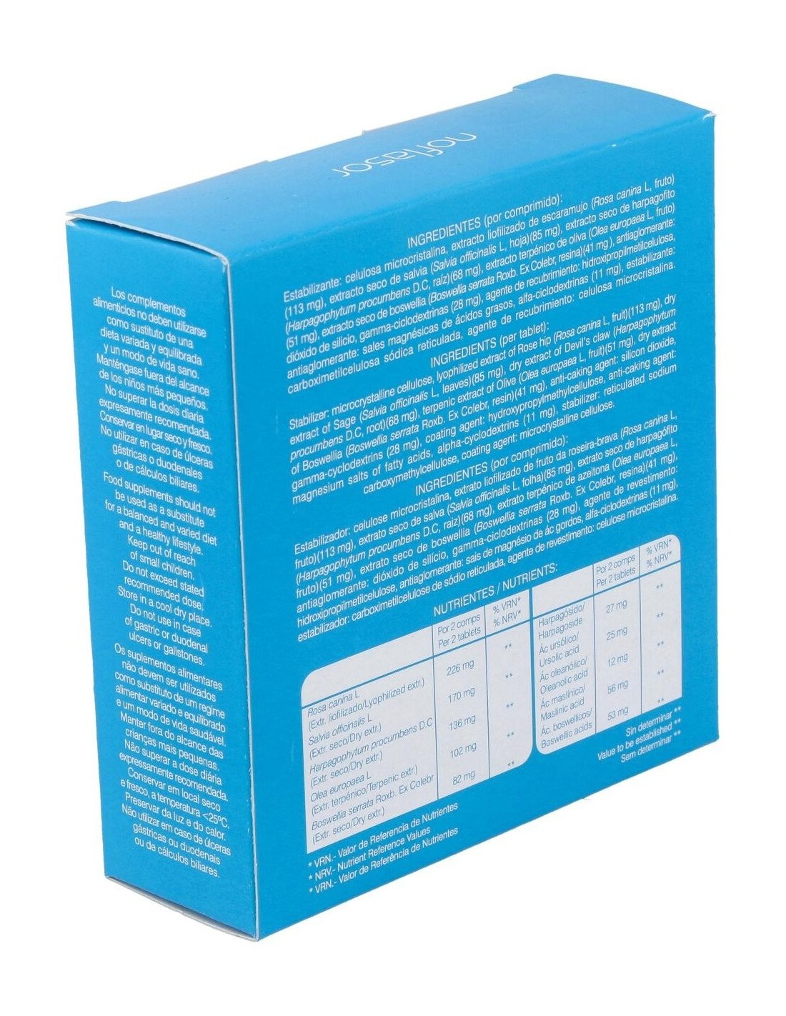 Ingredientes activos por 2 comprimidos: 305,08 mg de extracto liofilizado de rosa canina (56 mg ácido maslínico). 169,5 mg de extracto seco de salvia (25,4 mg ácido ursólico). 135,6 mg de extracto seco de harpagofito (27 mg harpagósidos). 101,7 mg de extracto terpénico de oliva (12,2 mg ácido oleanólico). 81,36 mg de extracto seco de boswellia serrata (53 mg ácidos boswélicos).
