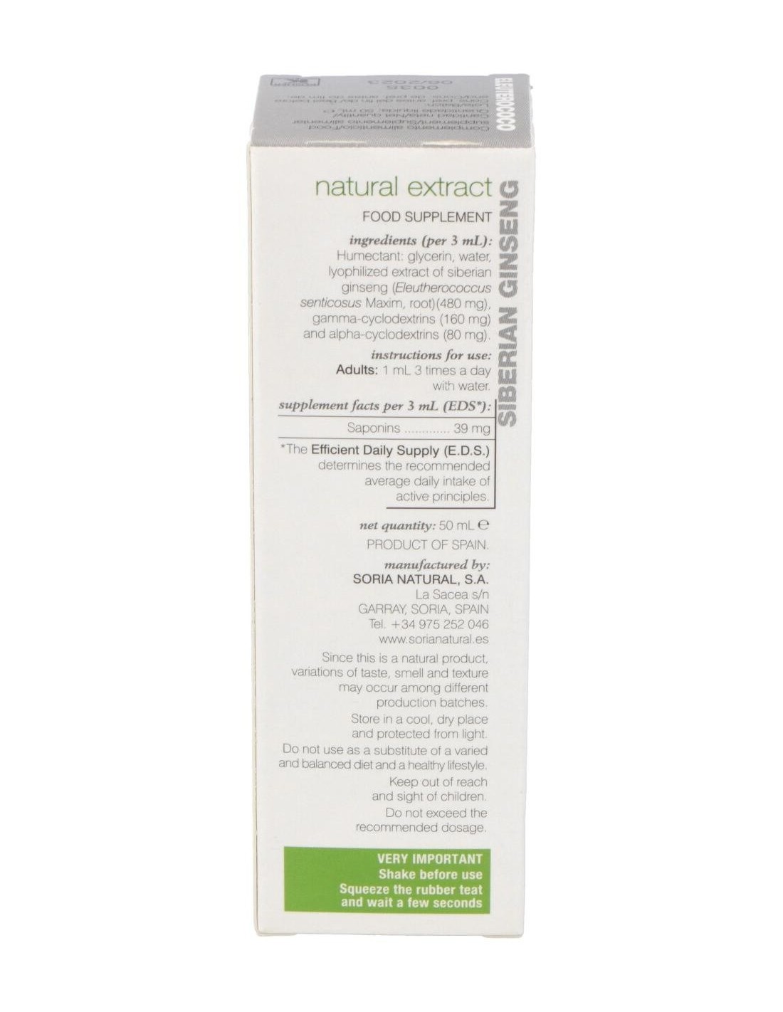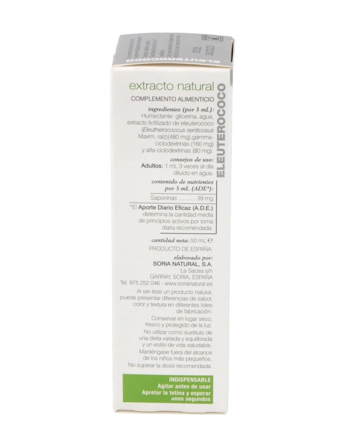 SORIA NATURALComplemento alimenticio de extracto de Eleuterococo que posee propiedades adaptogénicas significativas, mejorando la tolerancia hacia el estrés físico, mental y ambiental. Este extracto de eleuterococo tiene entre sus propiedades la de ser un estimulante general, afrodisíaco y estimulante de las defensas.