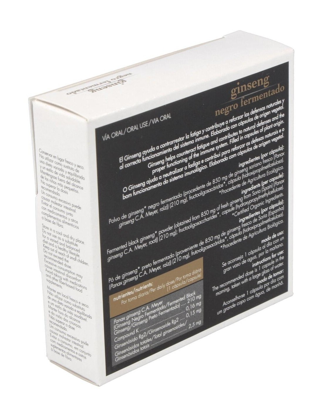 Polvo de ginseng* negro fermentado (procedente de 850 mg de ginseng soriano fresco (Panax ginseng C.A. Meyer, raíz) (210 mg), fructooligosacáridos*, Compound K (0,16 mg), gingenósido Rg2 (0,15 mg), gingenósidos totales (2,5 mg) (cápsula (hidroxipropilmetilcelulosa).