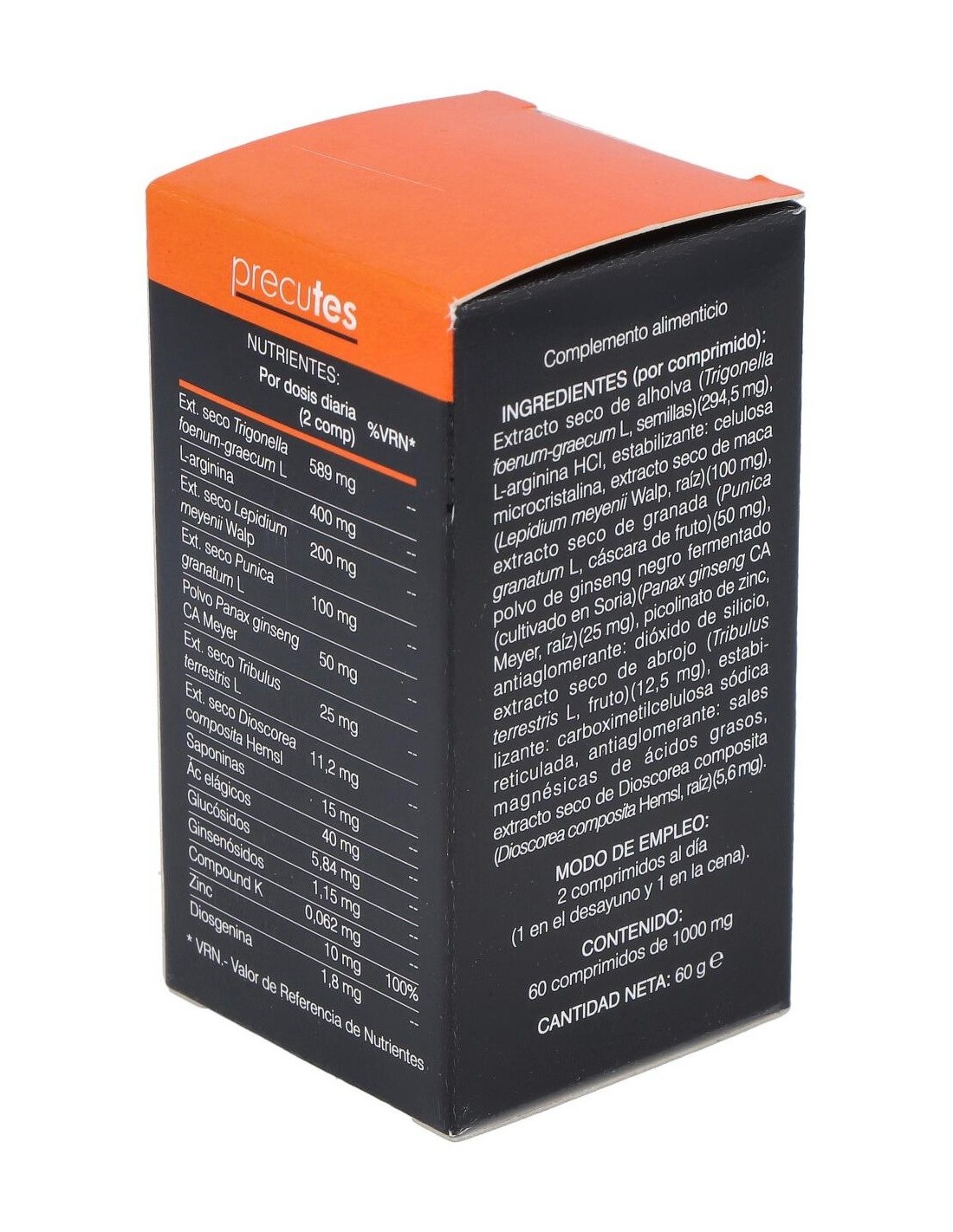 Extracto seco de alholva (Trigonella foenum-graecum L, semillas) (294,5 mg), L-arginina HCI, estabilizante: celulosa microcristalina, extracto seco de maca (Lepidium meyenii Walp, raíz) (100 mg), extracto seco de granada (Punica granatum L, cáscara de fruto) (50 mg), polvo de ginseng negro fermentado (cultivado en Soria) (Panax ginseng CA Meyer, raíz) (25 mg), picolinato de zinc, antiaglomerante: dióxido de silicio., extracto seco de abrojo (Tribulus terrestris L, fruto) (12,5 mg), estabilizante: carboximetilcelulosa sódica reticulada, antiaglomerante: sale magnésicas de ácidos grasos, extracto seco de Dioscorea composita (Dioscorea composita Hemsl, raíz) (5,6 mg).