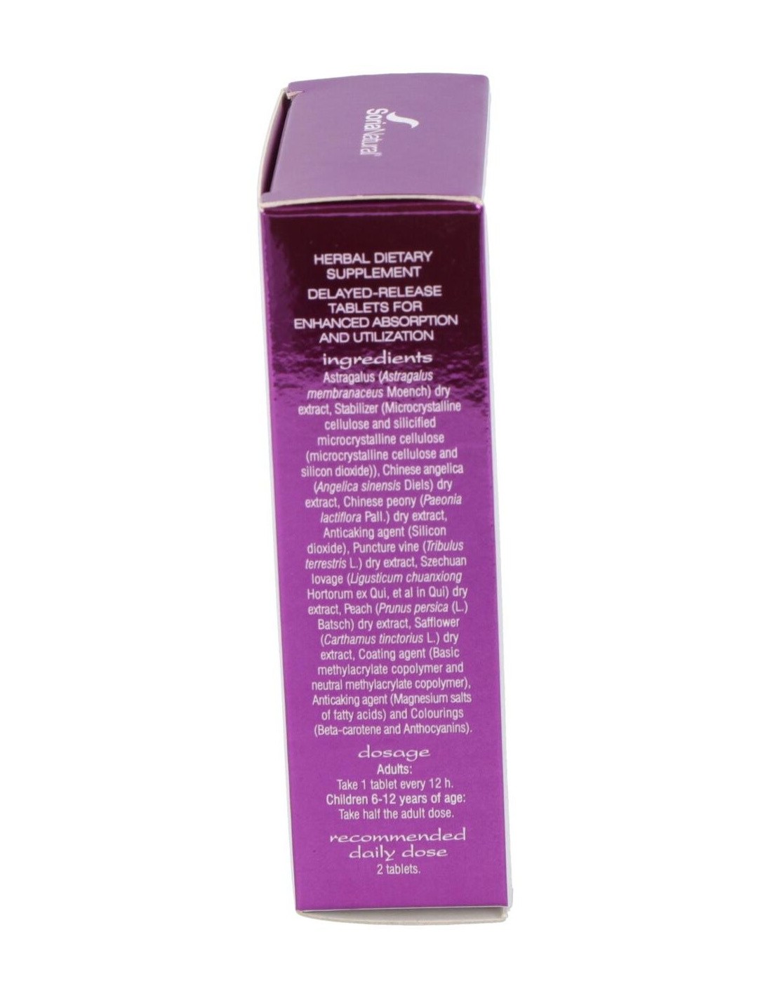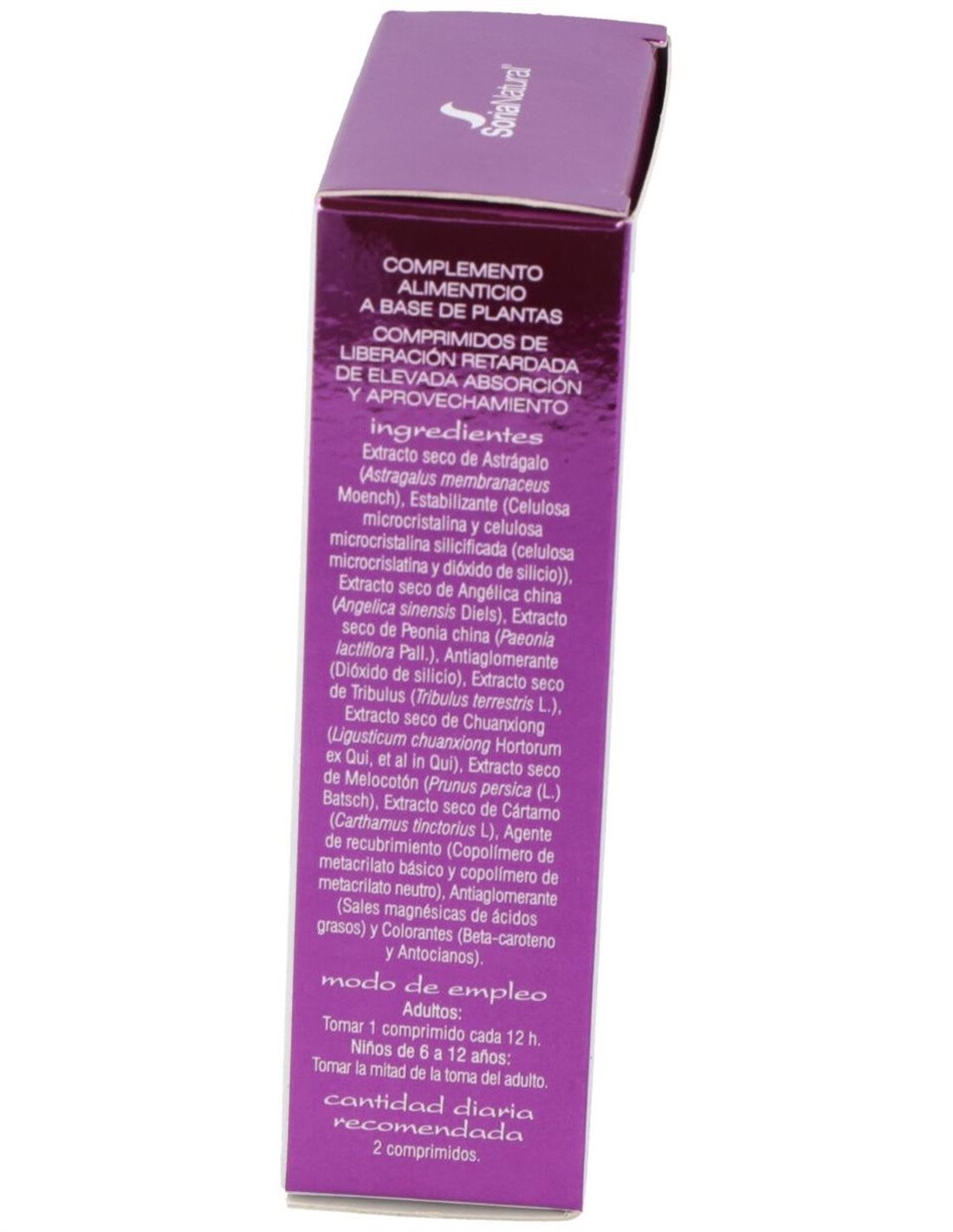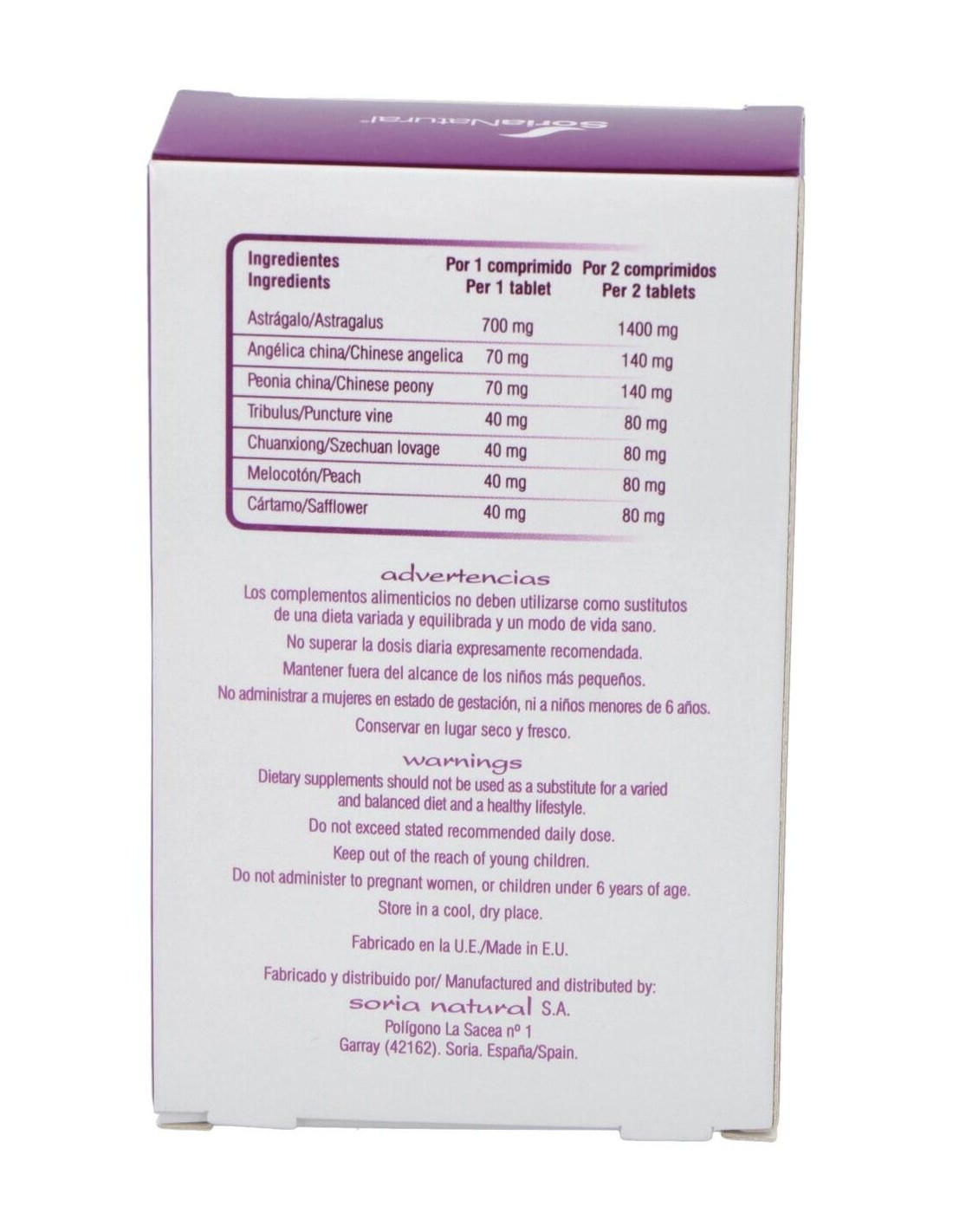 Extracto seco de Astrágalo (Astragalus membranaceus Moench), Estabilizante (Celulosa microcristalina), Extracto seco de Angélica china (Angelica sinensis Diels), Extracto seco de Peonia china (Paeonia lactiflora Pall.), Estabilizante (Hidroxipropilcelulosa), Extracto seco de Tribulus (Tribulus terrestris L.), Extracto seco de Chuanxiong (Ligusticum chuanxiong Hortorum ex Qui, et al in Qui), Extracto seco de Melocotón (Prunus persica (L.) Batsch), Extracto seco de Cártamo (Carthamus tinctorius L), Antiaglomerante (Dióxido de silicio), Agente de recubrimiento (Copolímero neutro), Antiaglomerante (Estearato de magnesio) y Colorantes (Beta-caroteno y Antocianos)