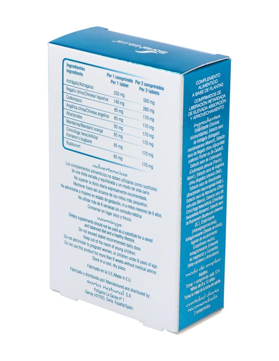 Estabilizante (Celulosa microcristalina), Extracto seco de Astrágalo (Astragalus membranaceus Moench), Extracto seco de Regaliz chino (Glycyrrhiza uralensis Fischer ex De Candoll), Extracto seco de Codonopsis (Codonopsis pilosula (Franch.) Nannf.), Extracto seco de Angélica china (Angelica sinensis Diels), Extracto seco de Atractylodes (Atractylodes macrocephala Koidz.), Extracto seco de Mandarina (Citrus reticulata Blanco), Extracto seco de Cimicifuga heracleifolia (Cimicifuga heracleifolia Komarov), Extracto seco de Bupleurum (Bupleurum chinense DC.), Estabilizante (Hidroxipropilcelulosa), Antiaglomerante (Dióxido de silicio), Agente de recubrimiento (Copolímero neutro), Antiaglomerante (Estearato de magnesio) y Colorantes (Beta-caroteno y Antocianos).