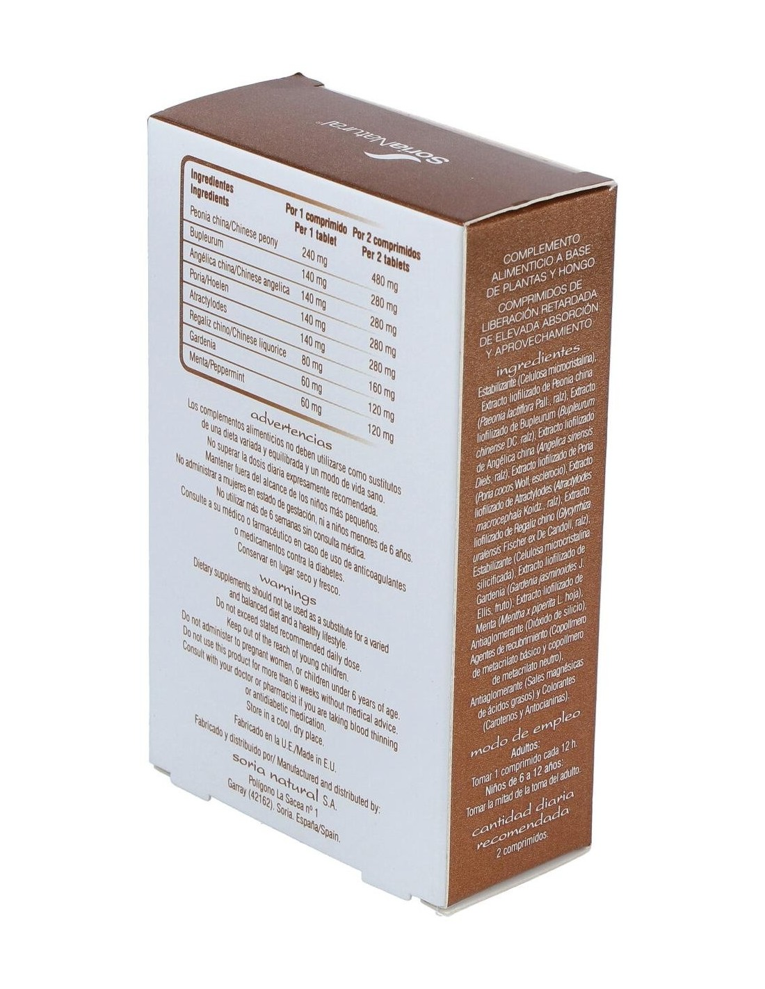 Estabilizante (Celulosa microcristalina), Extracto seco de Peonia china (Paeonia lactiflora Pall.), Extracto seco de Bupleurum (Bupleurum chinense DC.), Extracto seco de Angélica china (Angelica sinensis Diels), Extracto seco de Poria (Poria cocos Wolf), Extracto seco de Atractylodes (Atractylodes macrocephala Koidz.), Extracto seco de Regaliz chino (Glycyrrhiza uralensis Fischer ex De Candoll), Estabilizante (Hidroxipropilcelulosa), Extracto seco de Gardenia (Gardenia jasminoides J. Ellis), Extracto seco de Menta (Mentha piperita L.), Antiaglomerante (Dióxido de silicio), Agente de recubrimiento (Copolímero neutro), Antiaglomerante (Estearato de magnesio) y Colorantes (Beta-caroteno y Antocianos).