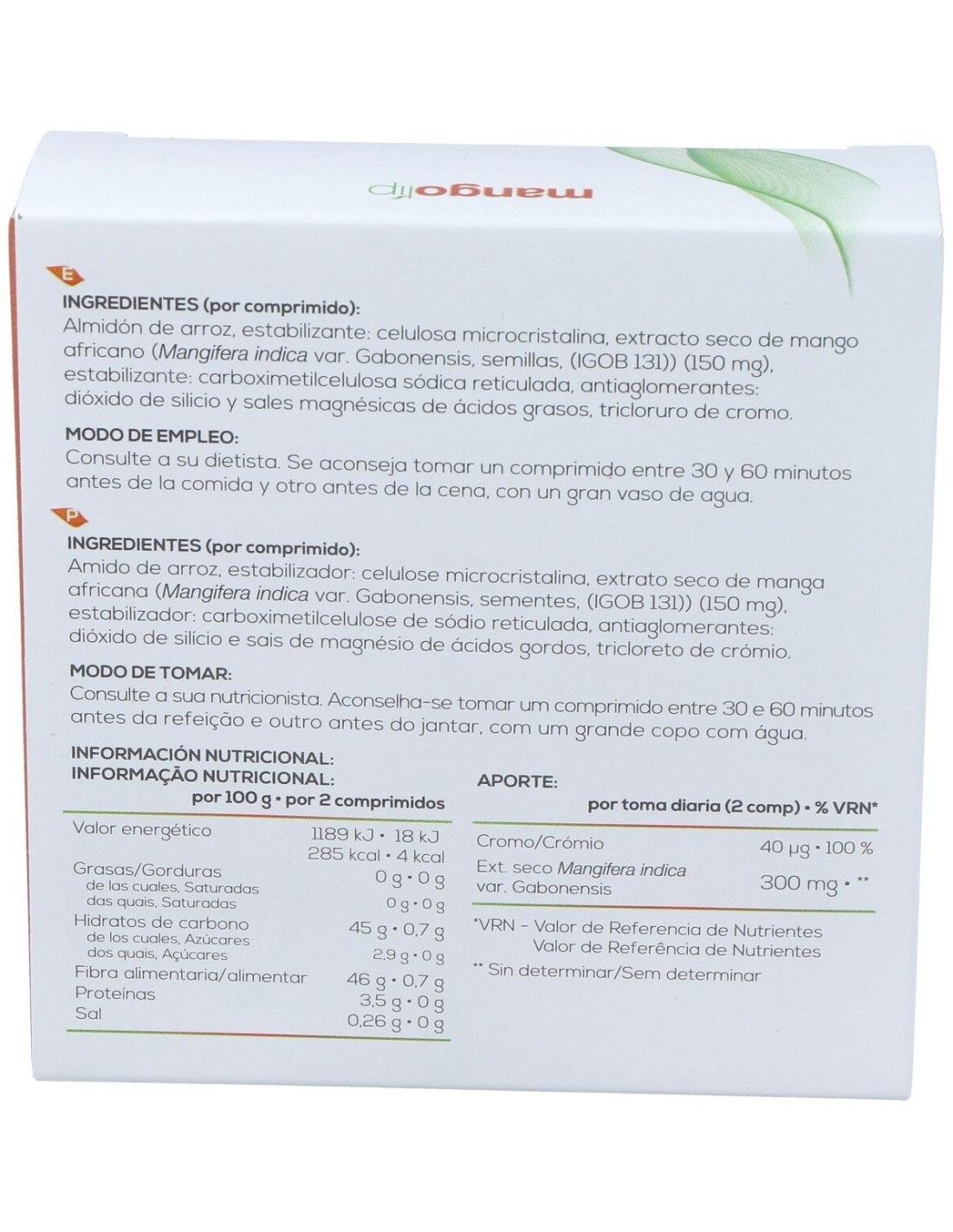 Almidón de arroz, estabilizante: celulosa microcristalina, extracto seco de semillas de mango africano (IGOB 131) (150 mg), estabilizante: carboximetilcelulosa sódica reticulada, antiaglomerantes: dióxido de silicio y sal magnésica de ác grasos, tricloruro de cromo.