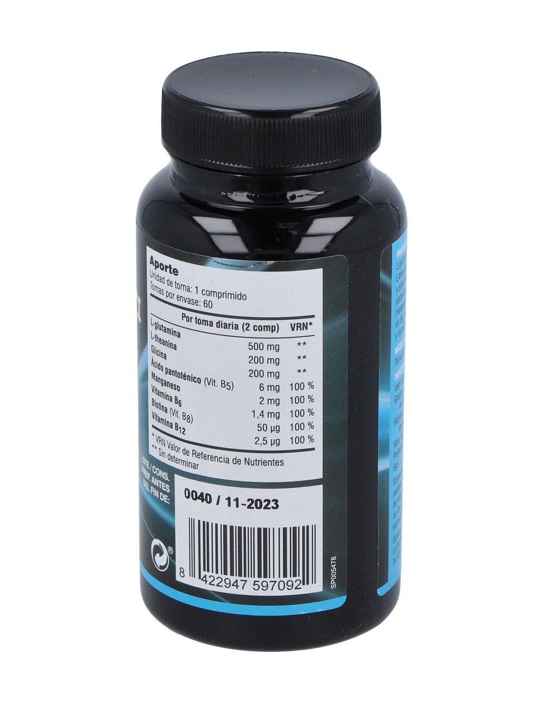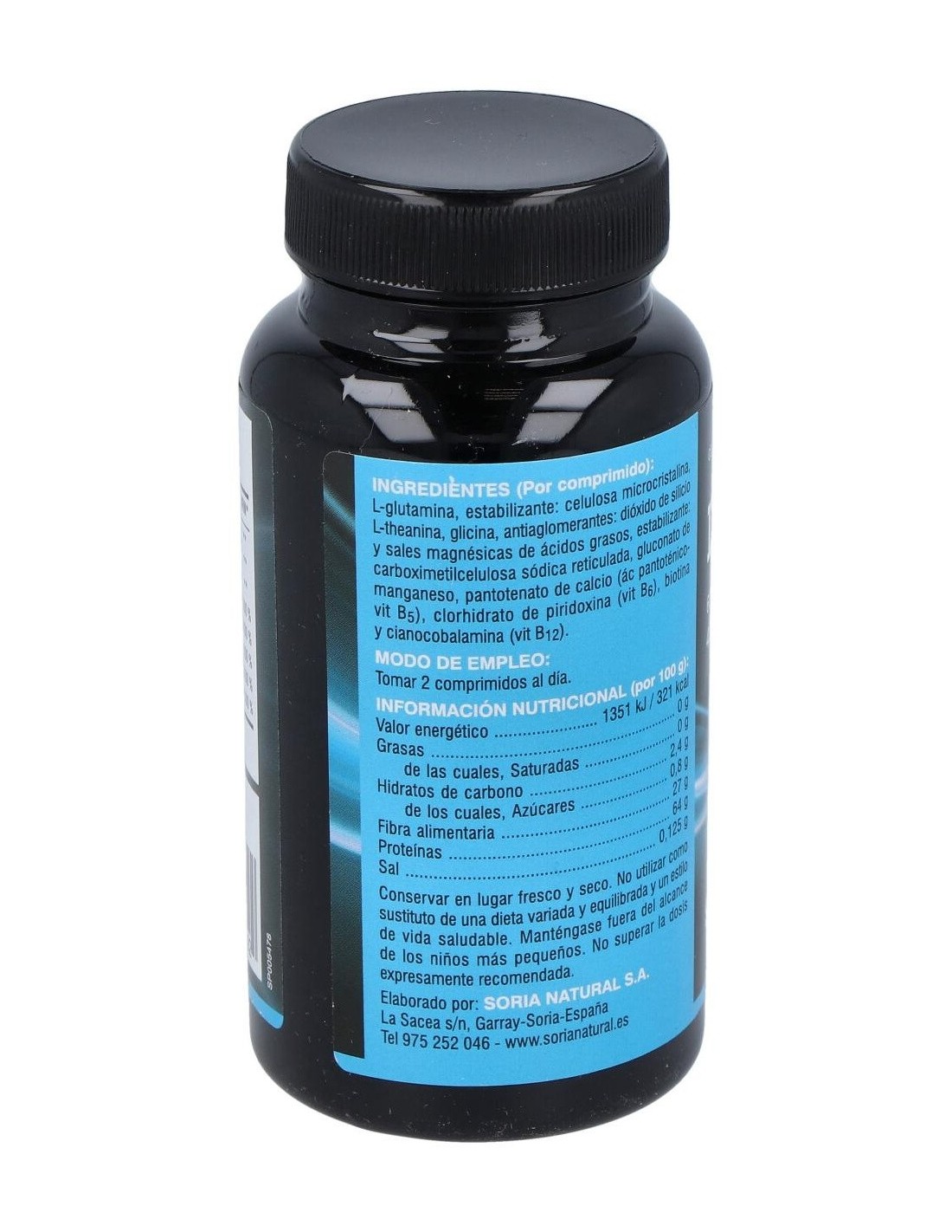 L-Theanina, Ácido gamma aminobutírico, L-glutamina, Clorhidrato de piridoxina, Gluconato de manganeso, Cianocobalamina, Biotina, Pantotenato cálcico, Estabilizador: Celulosa microcristalina, Antiaglomerante: Dióxido de silicio, Disgregante: Croscarmelosa sódica, Sal magnésica de ácidos grasos: Estearato de magnesio.