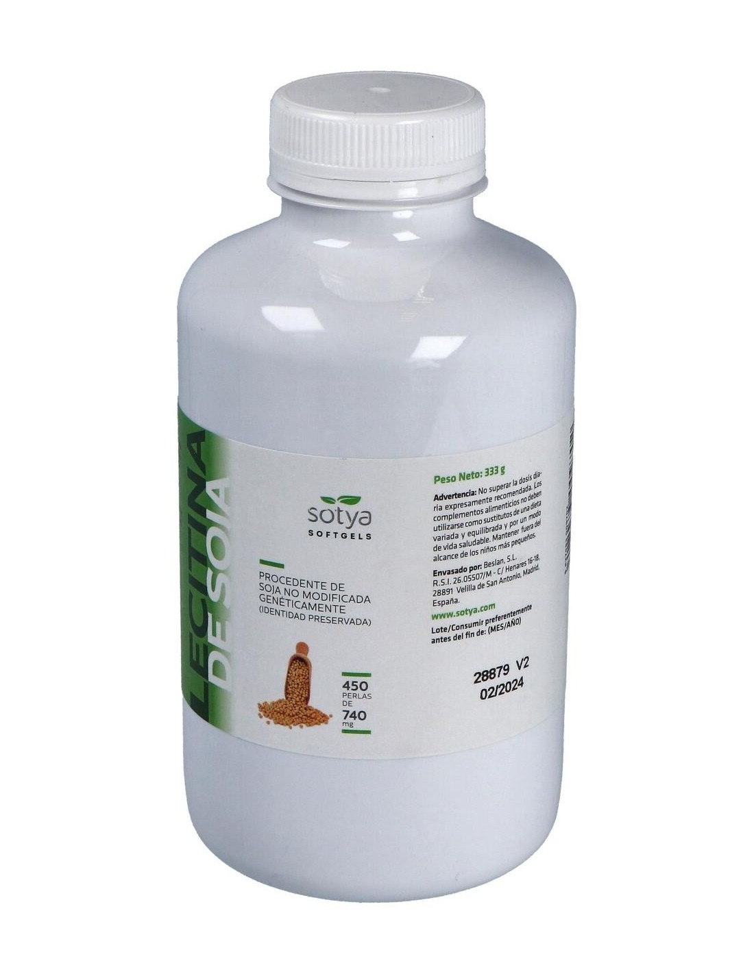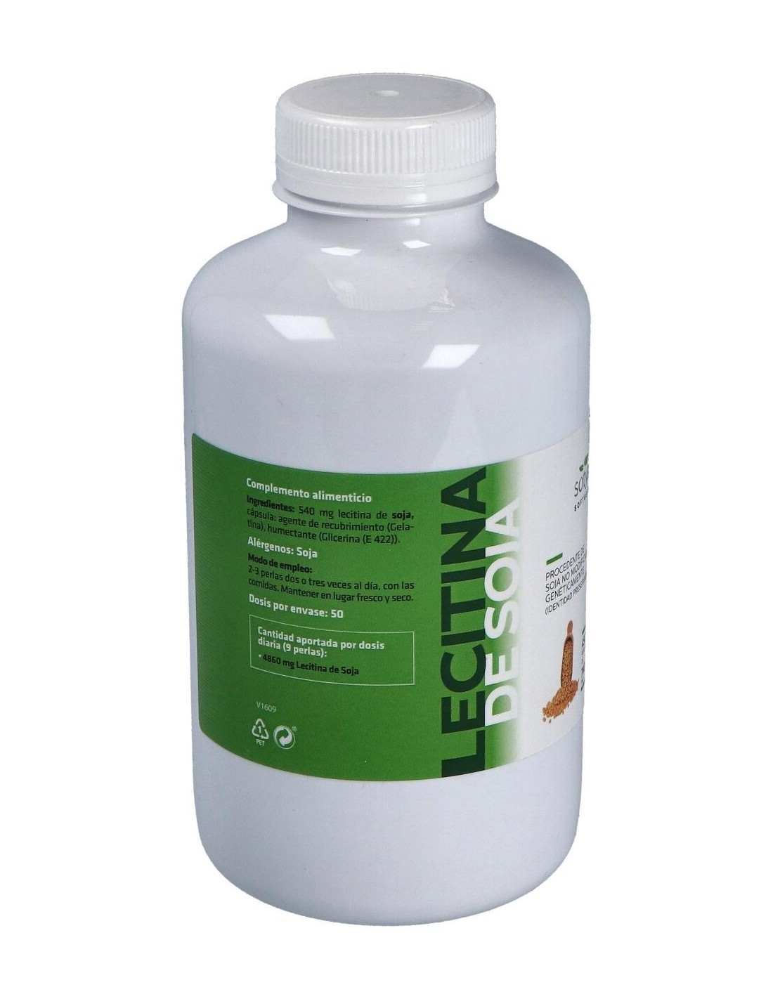 Perlas con 500mg de aceite de lecitina de soja no GMO, en una cápsula de gelatina y glicerina.