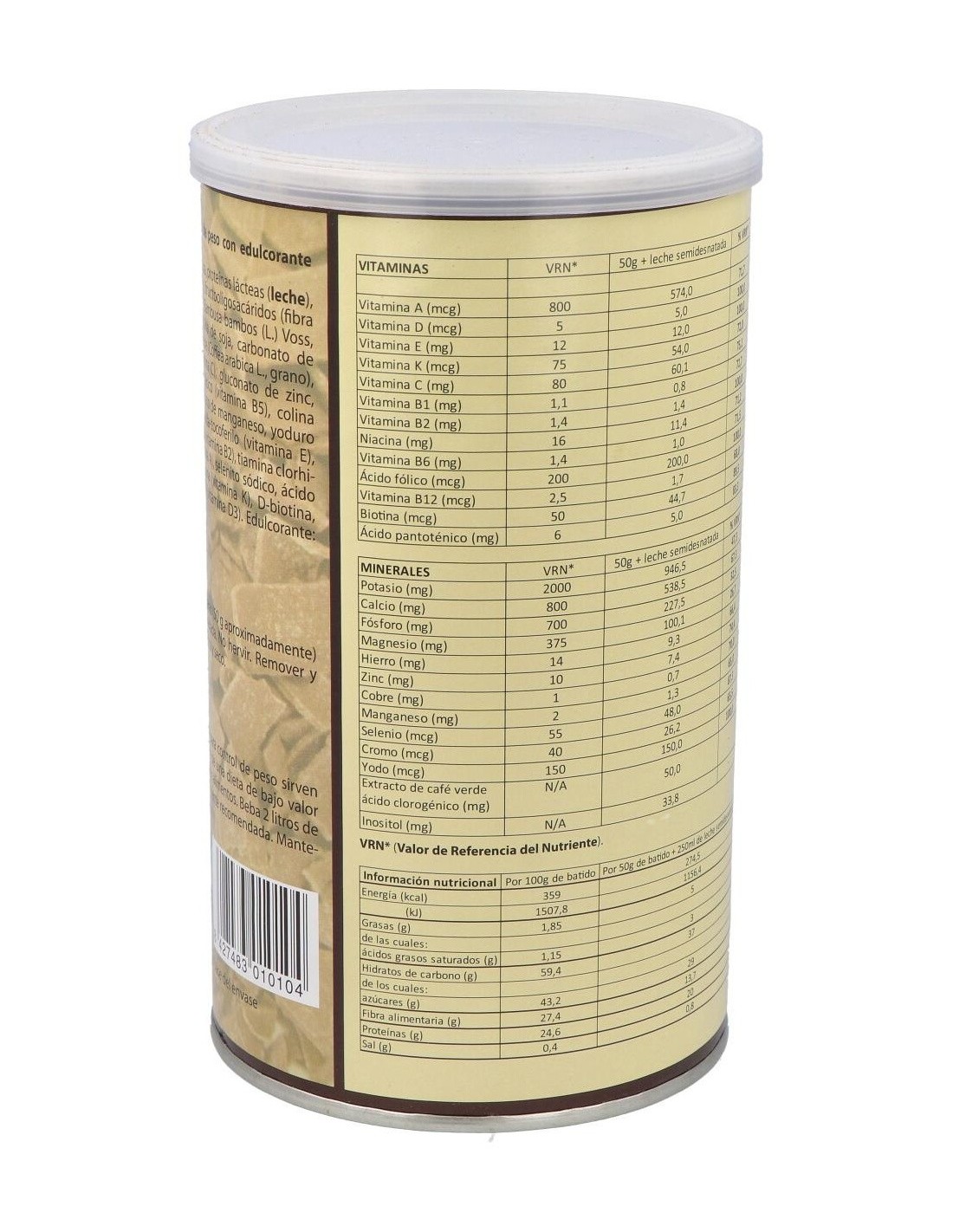 Leche desnatada en polvo, fructosa, proteínas lácteas (leche), cacao desgrasado (Theobroma cacao L, grano), fructooligosacáridos (fibra de achicoria), maltodextrina, fibra de bambú (Bambusa manbos (L.) Voss, tallo), espesante: goma xantana (E415), lecitina de soja, carbonato de magnesio, citrato potásico, extracto café verde (Coffea arabica L., grano), gluconato de hierro, ácido L-ascórbico (vitamina C), gluconato de zinc, nicotinamida (vitamina B3), D-pantotenato cálcico (vitamina B5), colina bitartrato, inositol, gluconato de cobre, gluconato de manganeso, yoduro potásico, picolinato de cromo, acetato de D-alfa tocoferilo (vitamina E), piridoxina clorhidrato (vitamina B6), riboflavina (vitamina B2), tiamina clorhidrato (vitamina B1), acetato de retinilo (vitamina A), selenito sódico, ácido pteroilglutámico (ácido fólico), filoquinona (vitamina K), D-biotina, cianocobalamina (vitamina B12) y colecalciferol (vitamina D3). Edulcorante: sucralosa (E955).