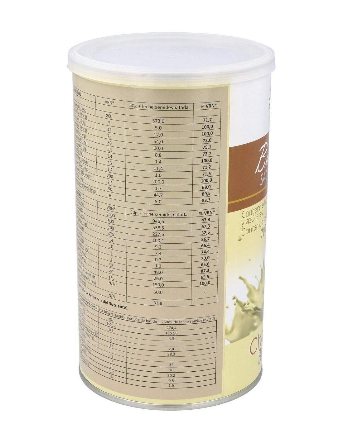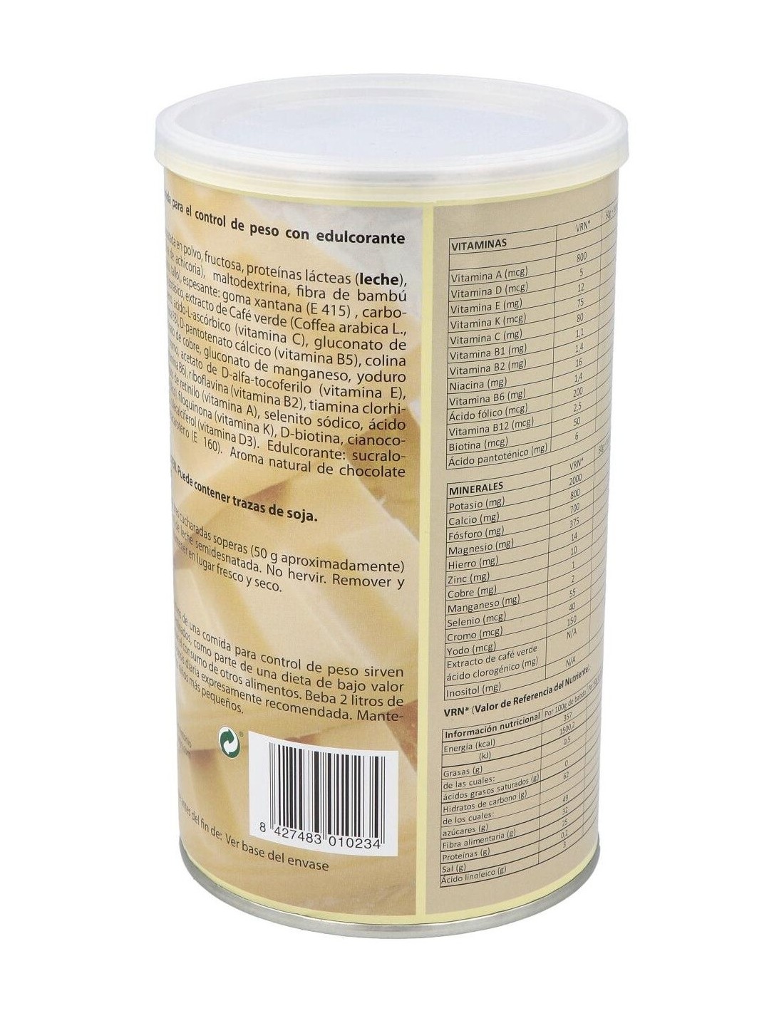 Leche desnatada en polvo, fructosa, proteínas lácteas (leche), fructooligosacáridos (fibra de achicoria), maltodextrina, fibra de bambú (Bambusa bambos (L.) Voss, tallo), espesante: goma xantana (E415), carbonato de magnesio, citrato potásico, extracto Café verde (Coffea arabica L., grano), gluconato de hierro, ácido L-ascórbico (vitamina C), gluconato de zinc, nicotinamida (vitamina B3), D-pantotenato cálcico (vitamina B5), colina bitartrato, inositol, citrato potásico, gluconato de cobre, gluconato de manganeso, yoduro potásico, picolinato de cromo, acetato de D-alfa tocoferilo (vitamina E), piridoxina clorhidrato (vitamina B6), riboflavina (vitamina B2), tiamina clorhidrato (vitamina B1), acetato de retinilo (vitamina A), selenito sódico, ácido pteroilglutámico (ácido fólico), filoquinona (vitamina K), D-biotina, cianocobalamina (vitamina B12) y colecalciferol (vitamina D3). Edulcorante: sucralosa (E955). Colorante Betacaroteno (E160). Aroma natural de chocolate blanco.