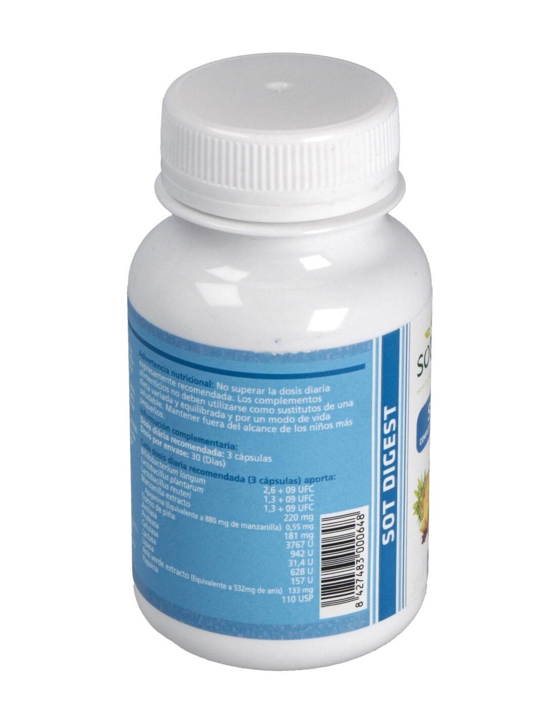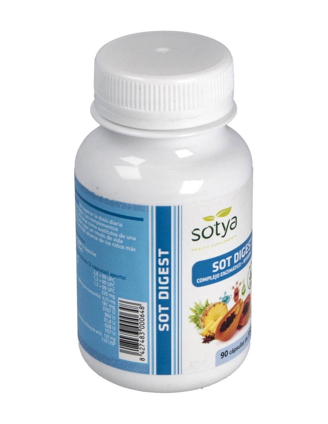 Sotya Sot Digest 550mg es un complemento alimenticio que engloba un conjunto de ingredientes que te ayudarán a facilitar la digestión y absorber mejor los nutrientes: enzimas digestivas, papaya y piña, bifidobacterias.