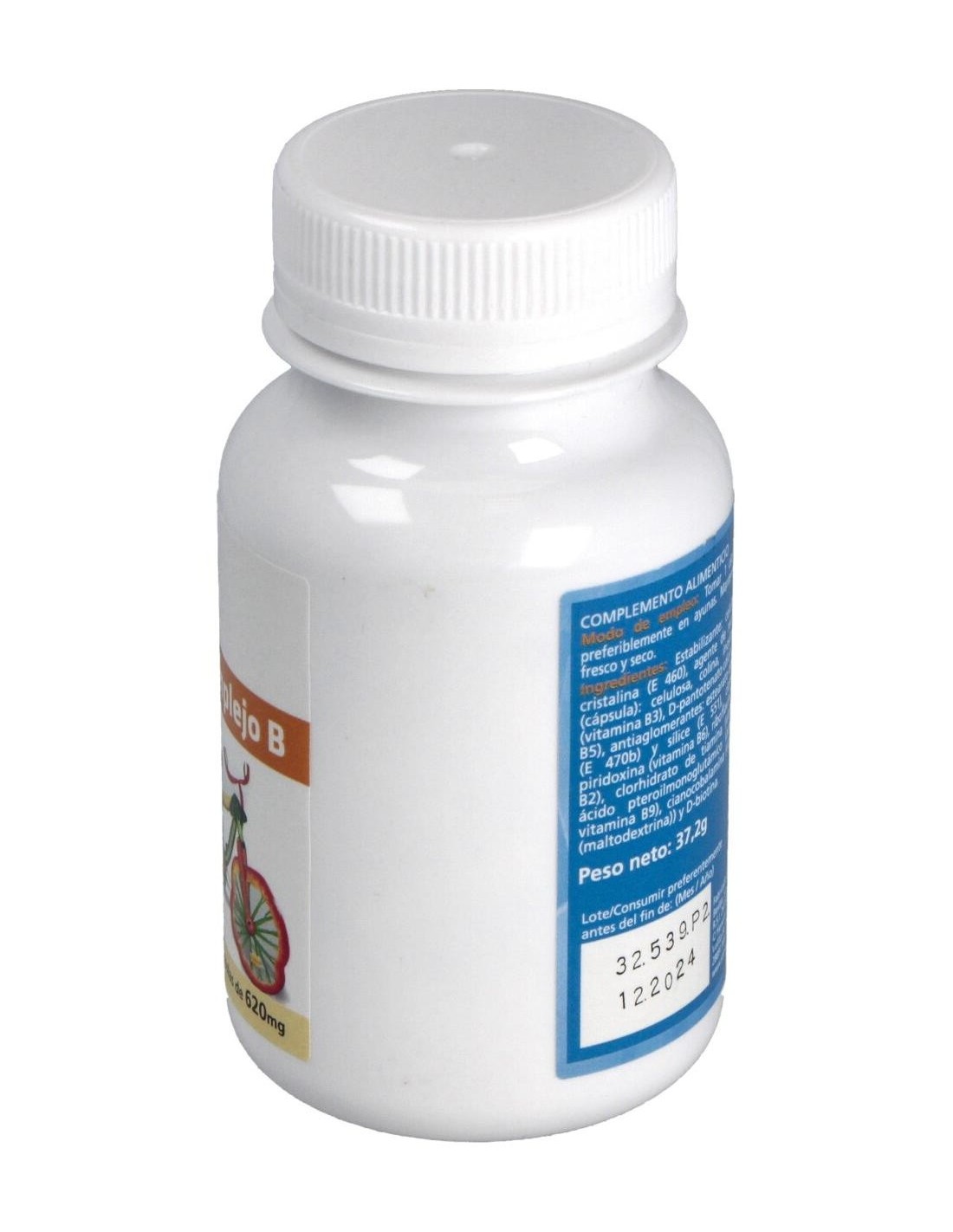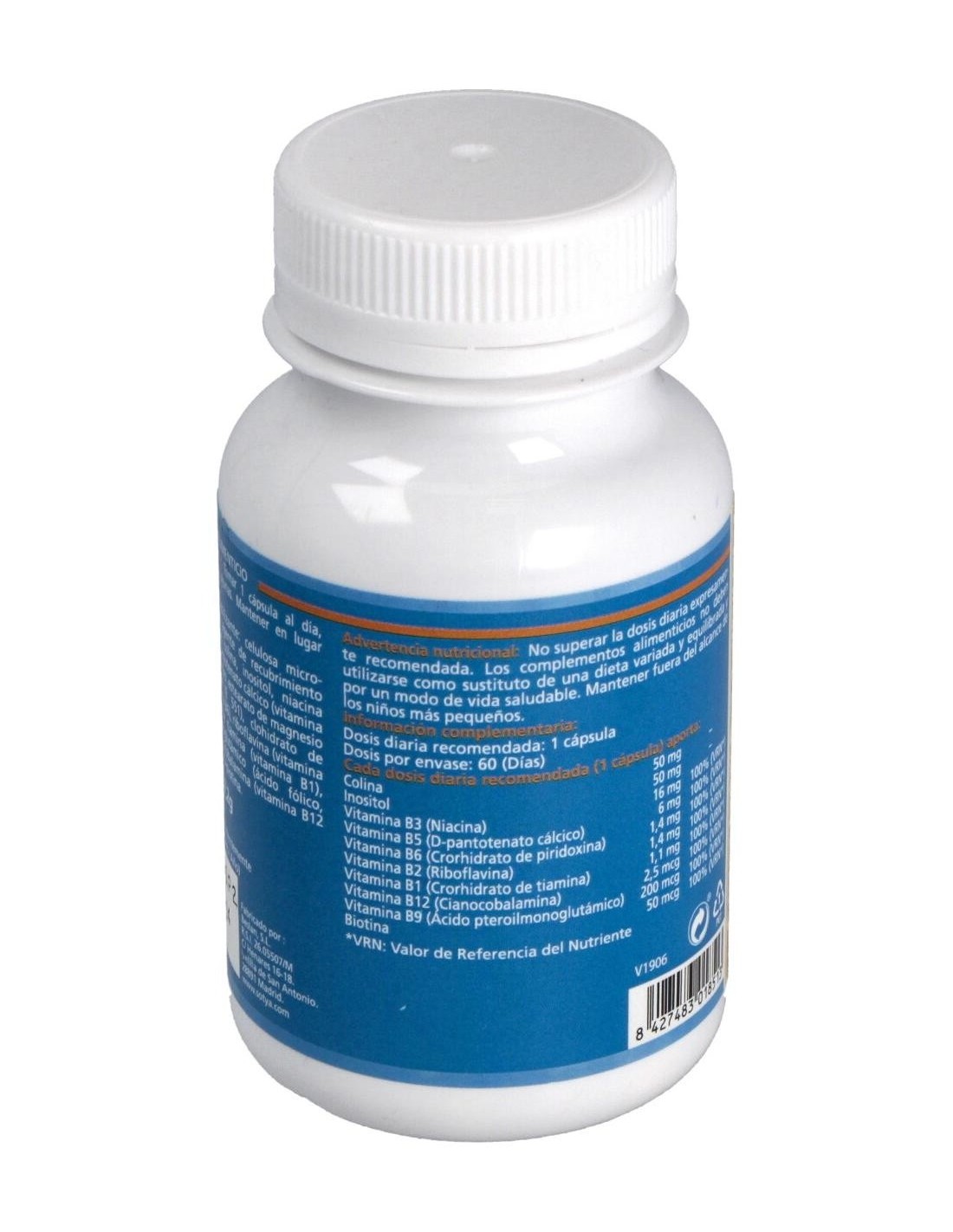 Cada cápsula contiene levadura de cerveza (370mg), colina (50mg), inositol (50mg), vitamina B3 (18mg), vitamina B5 (6mg), vitamina B6 (2mg), vitamina B2 (1.6mg), vitamina B1 (1.4mg), vitamina B9 (0.2mg), vitamina B12 (0.001mg), biotina (0.00015mg). Una cápsula aporta el 100% de la CDR de todas las vitaminas del complejo B.