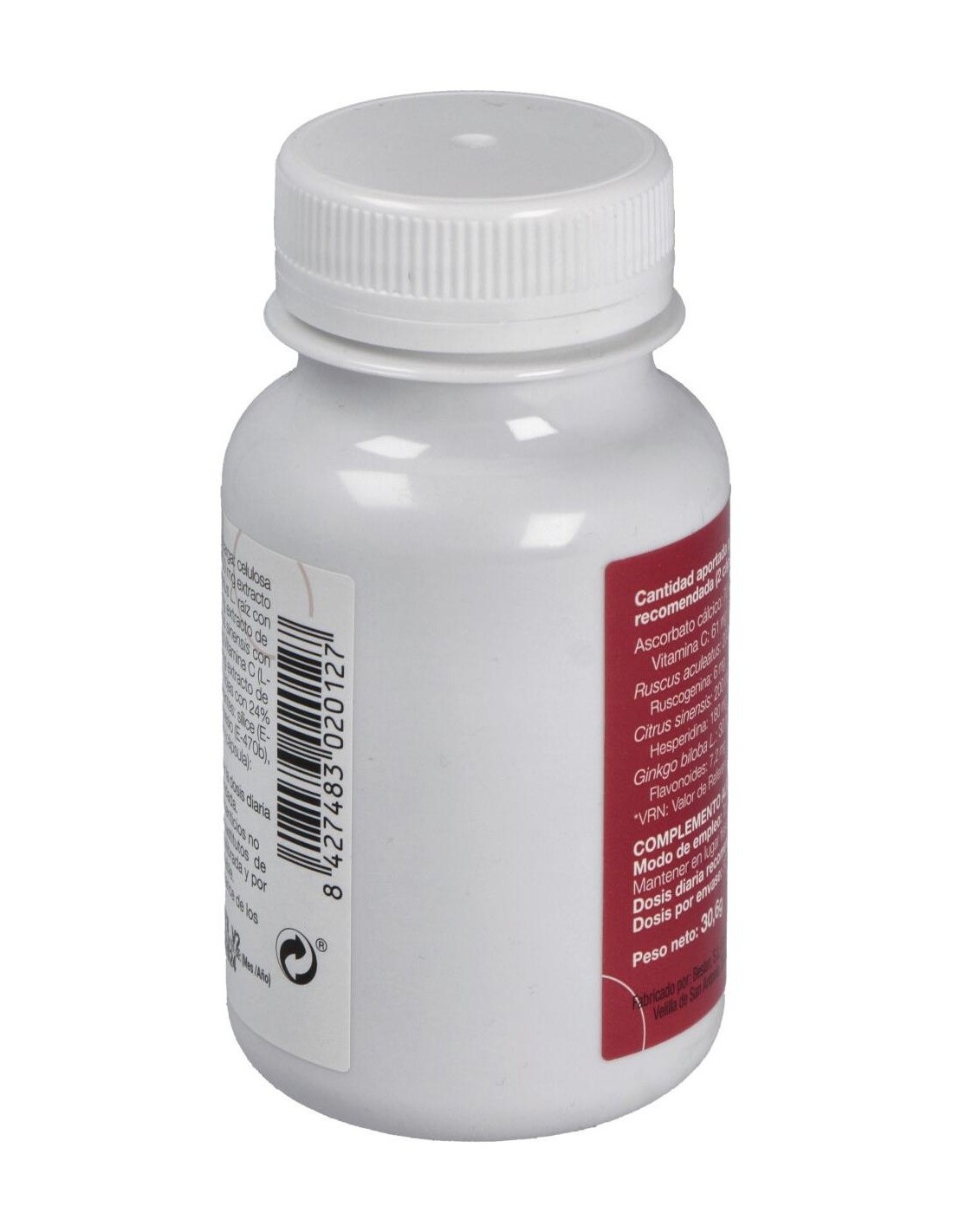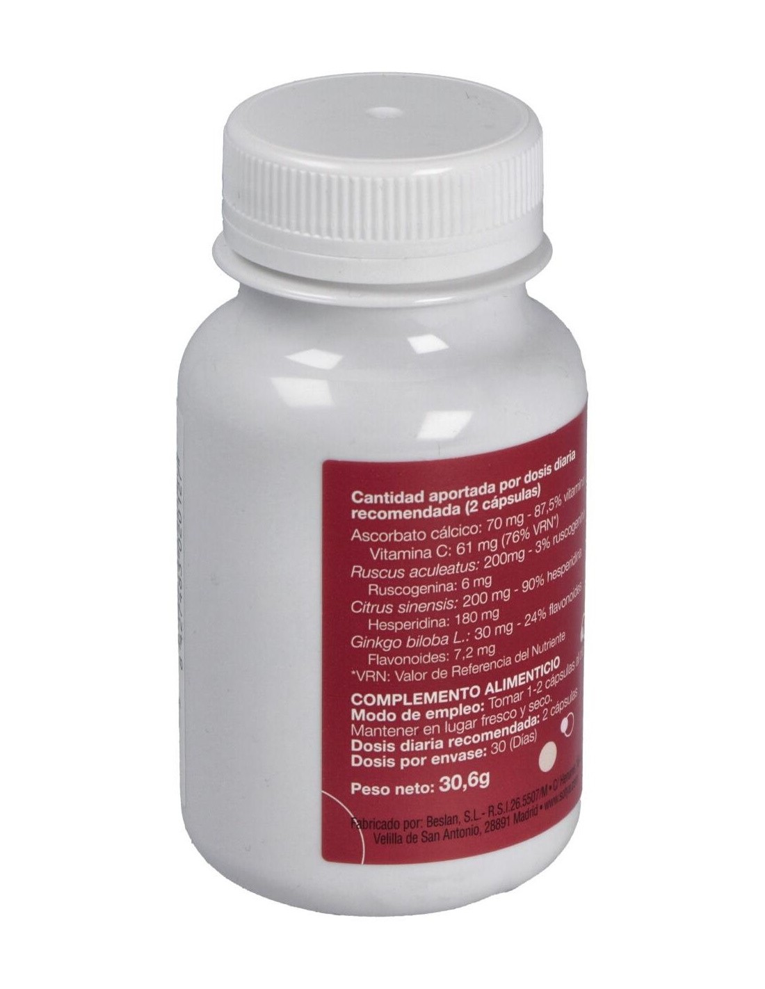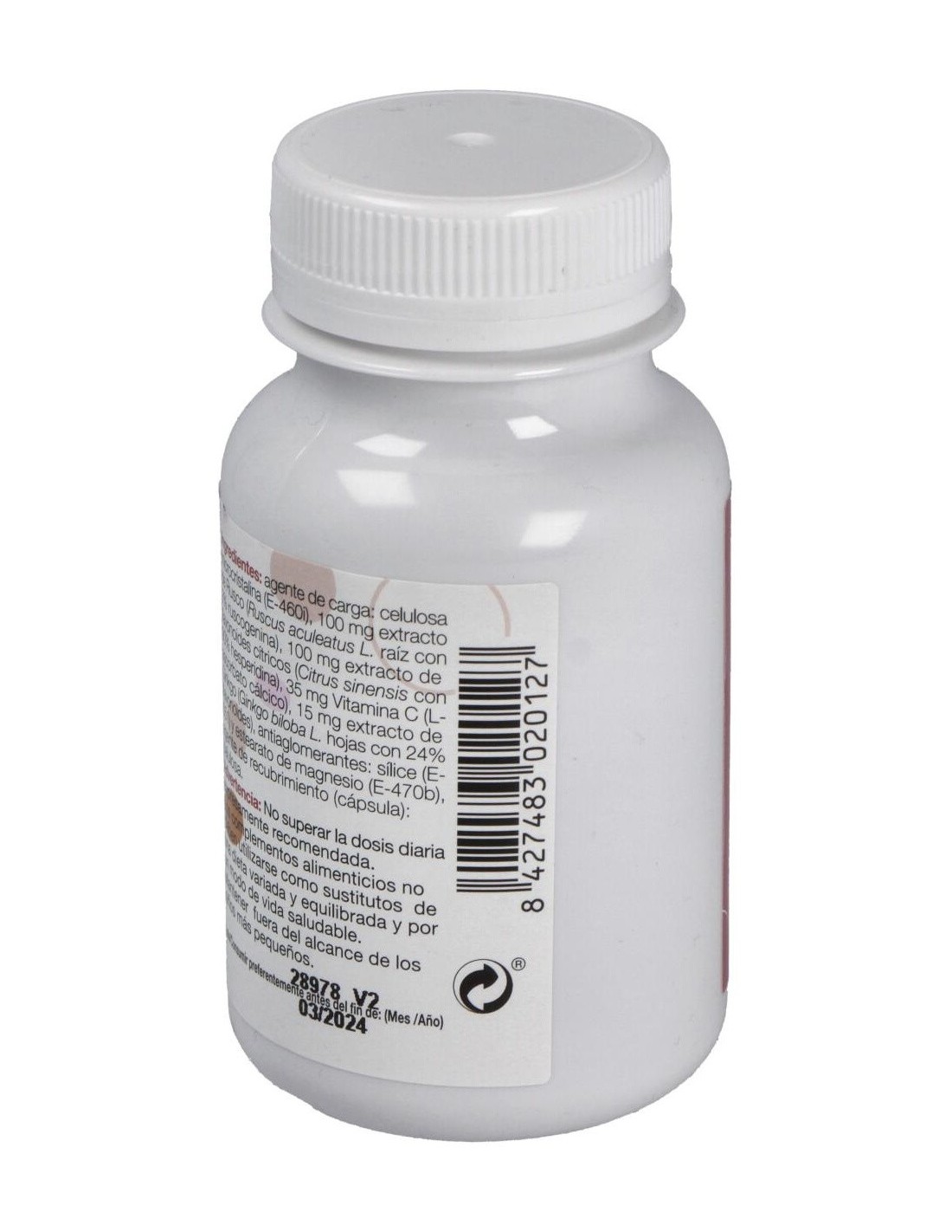 Agente de carga celulosa microcristalina-microcrystalline cellulose, Ruscus aculeatus L. extra. 200 mg, ruscogin, Citrus sinensis L.ext -200 mg, 90 mg, hesperidine, Vit C acido L-ascorbato calcico, 70 mg, Ginkgo biloba L.extr. 30 mg, antiaglomerantes, magnesium sterarate dioxido de silice.