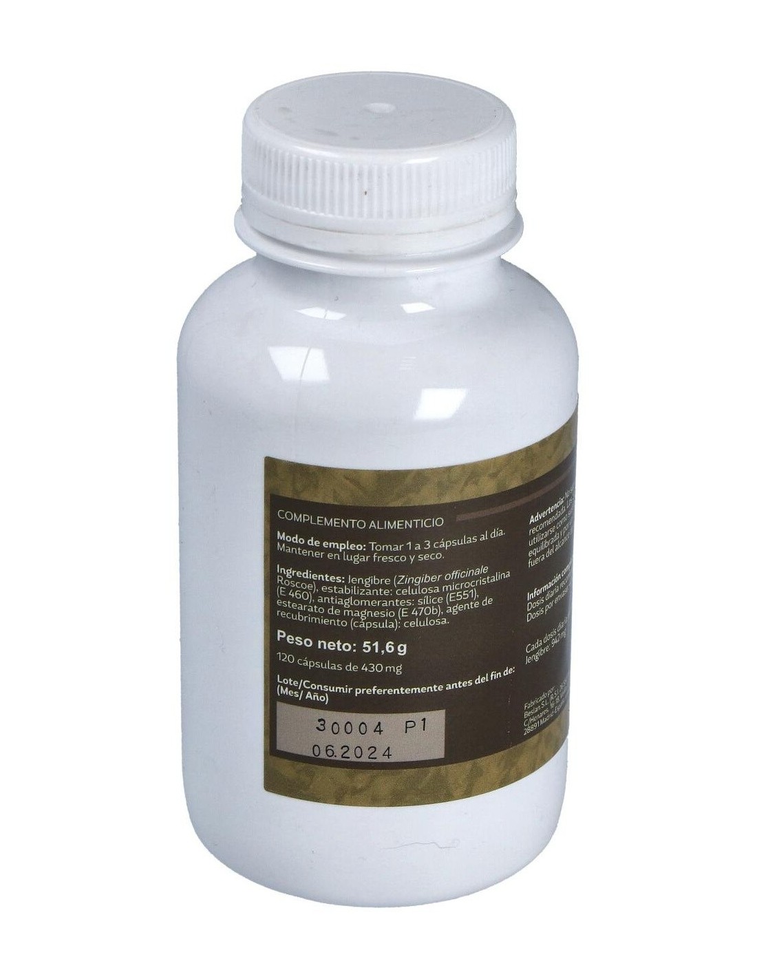 Jengibre rizoma. Estabilizante: celulosa microcristalina (E 460). Antiaglomerantes: sílice (E 551) y estearato de magnesio (E 470b).