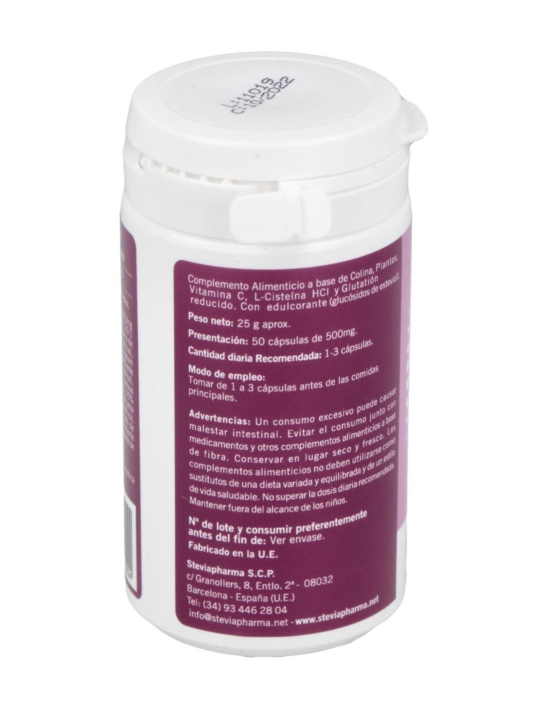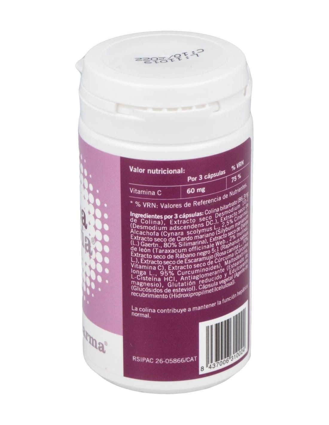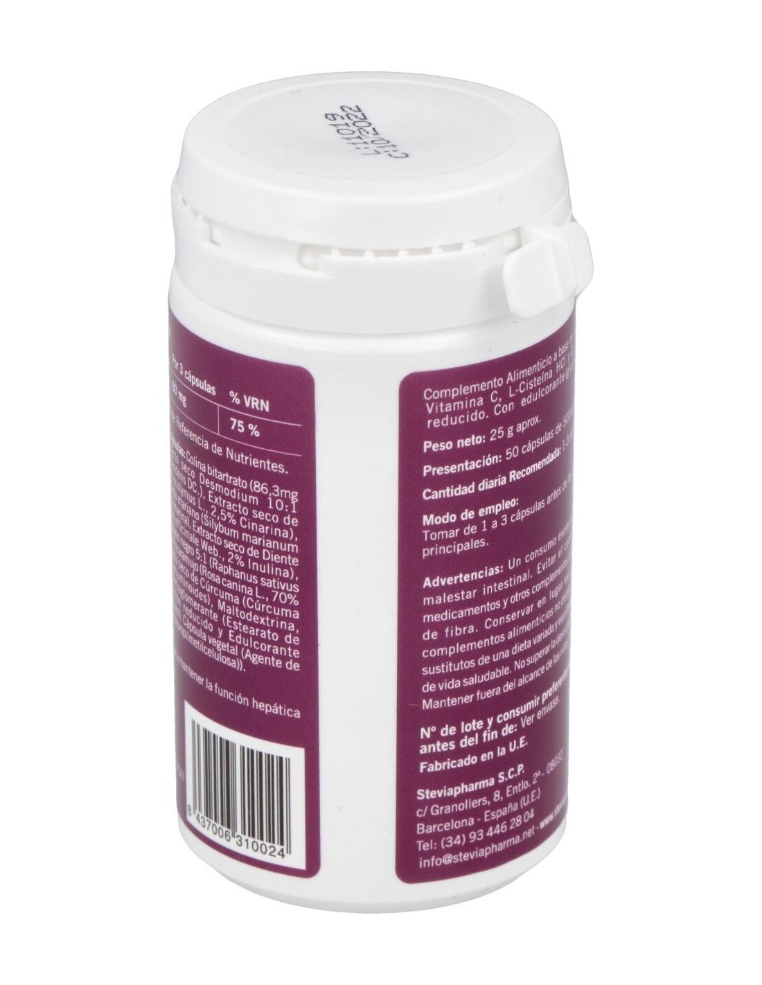 Extractos secos de desmodium, cardo mariano, alcachofera, rábano negro, diente de león, cúrcuma. Fruto de escaramujo, L-cisteína y L-glutatión, estearato de magnesio, maltodextrina, hidroxipropilmetilcelulosa.