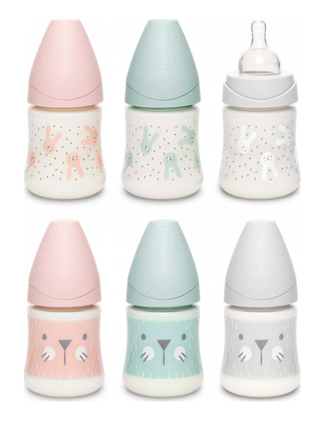 SUAVINEXBiberones premium de poliamida con tetina redonda tres posiciones de silicona con capacidad de 150ml. La tetina redonda 3 posiciones, se adapta a la necesidad del bebé y al tipo de alimento ya que, tan sólo girando el biberón, permite regular la intensidad de la salida de líquido, garantizando una correcta succión desde el primer día.