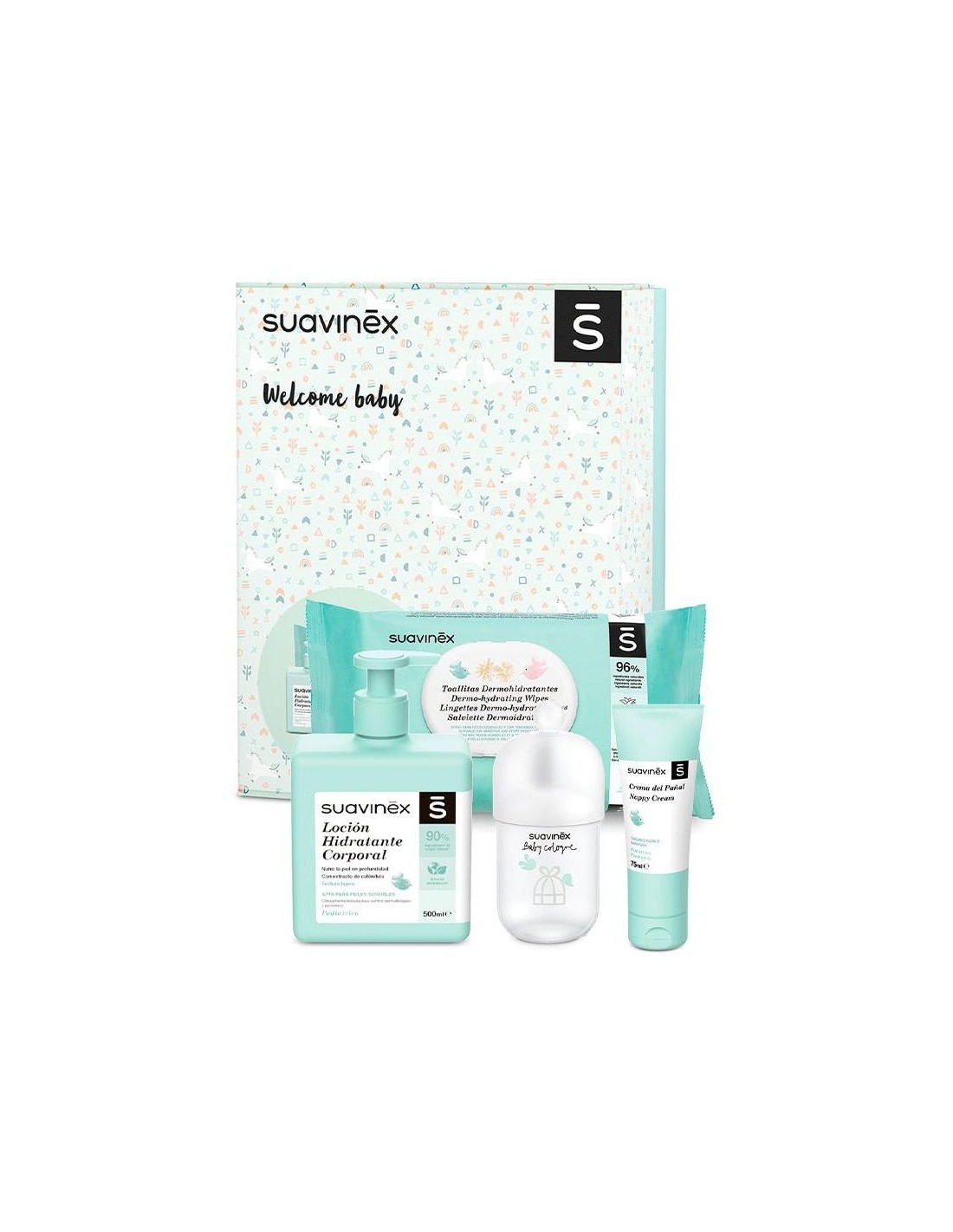 La marca Suavinex ofrece una canastilla de productos que contiene loción corporal de 400ml, una colonia de 100ml baja en alcohol y de agradable aroma. Tiene también un paquete de 72 toallitas húmedas que garantizan la mejor higiene del bebé y una crema para acompañar el pañal. Esta hidrata y protege la piel sensible después de baños o cambios de pañales.