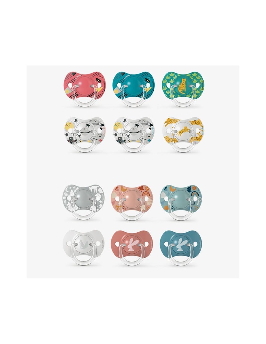 Además, puedes elegir entre tres diseños diferentes con colores y dibujos variados para adaptarse a cada ocasión. Estos chupetes son combinables con los biberones y cadenas de chupete de la misma colección.