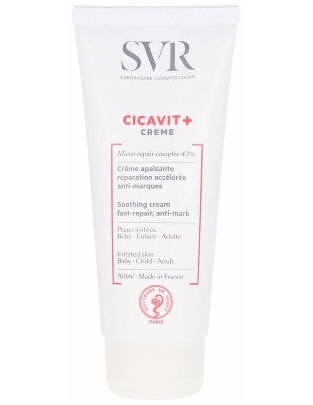 SVRCrema calmante con reparación acelerada anti-marcas. Para todas las pieles dañadas e irritadas: Sequedad, enrojecimiento, piel agrietada, sensación de calor, rojeces en las nalgas, marcas de varicela, tatuajes, procedimientos posdermatológicos (peeling, láser), inflamaciones, quemaduras solares, depilación, afeitado.