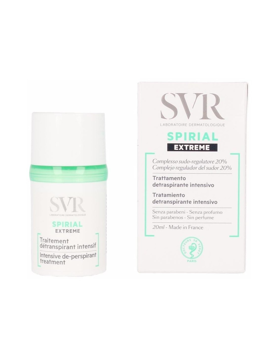 SVRSolución antitranspirante de alta tolerancia para combatir la transpiración extrema (estrés, humedad, deporte, uso de medicamentos...). Es efectiva desde la primera aplicación, gracias a su fórmula altamente concentrada en agentes reguladores del sudor que controlan la transpiración, absorben la humedad y luchan contra el mal olor. Todo tipo de pieles, incluso las más sensibles. Transpiración excesiva o hiperhidrosis. Adolescentes a partir de 12 años (por recomendación médica), adultos. Axilas.