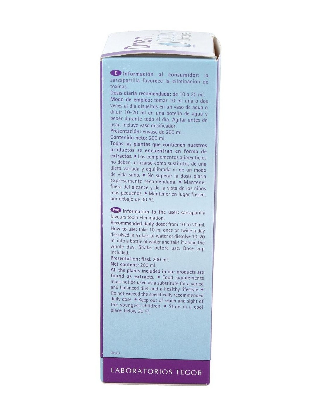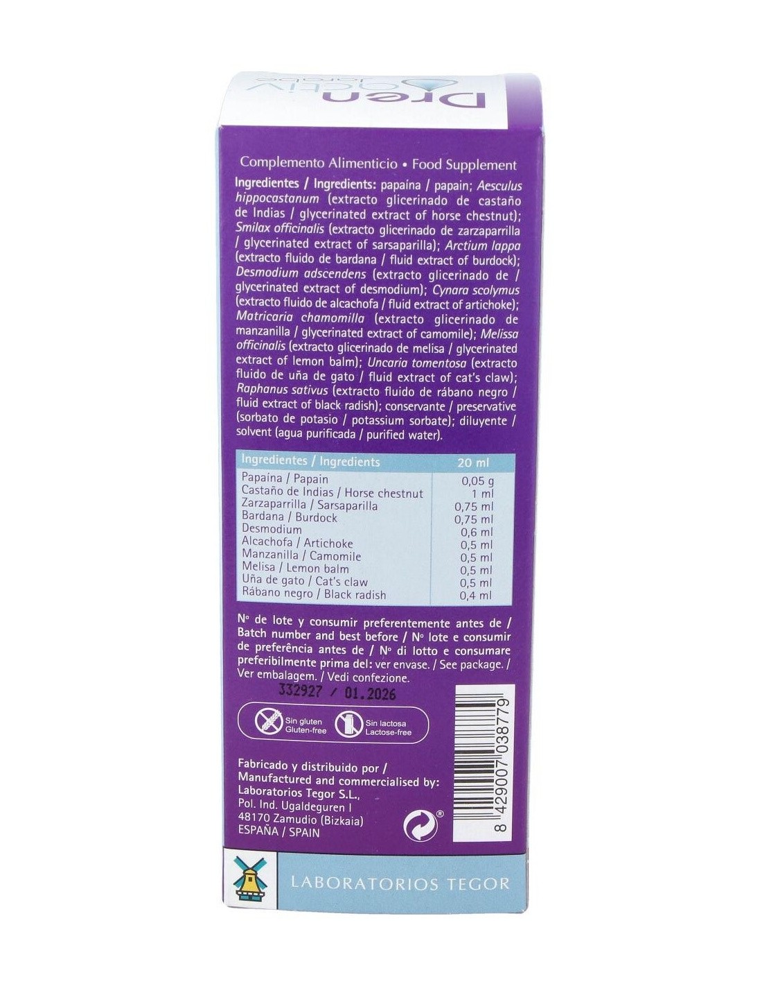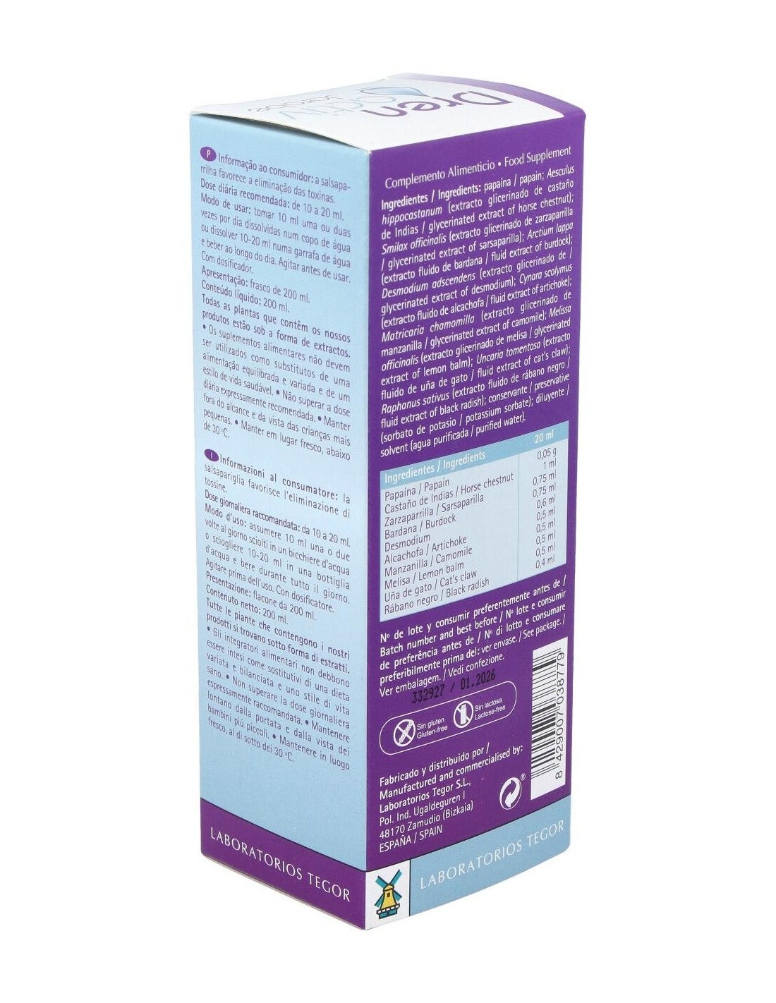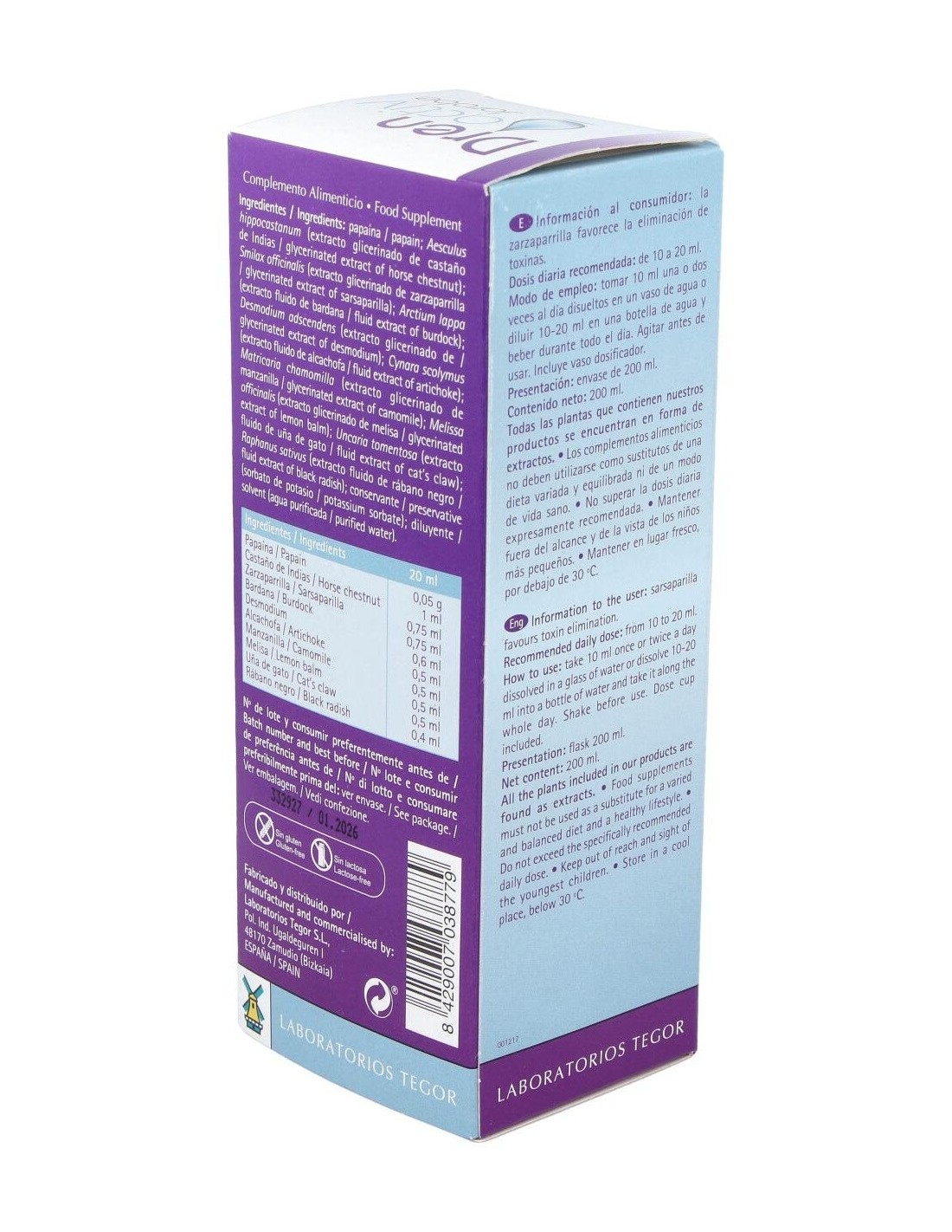 Fructosa, 50 g: papaína, 0,5 g: Aesculus hippocastanum (castaño de Indias), 10 ml: Smilax officinalis Humb., Bonpl. et Kunth (zarzaparrilla), 7,5 ml: Arctium lappa L (bardana), 7,5 ml: Desmodium adscendens DC. (desmodium), 6 ml: Cynara scolymus L. (alcachofa), 5 ml: Matricaria chamomilla L. (manzanilla), 5 ml: Melissa officinalis L. (melisa), 5 ml: Uncaria tomentosa (Willd) D.C. (uña de gato), 5 ml: Raphanus sativus (rábano negro), 4 ml: excipientes, c.s.p.