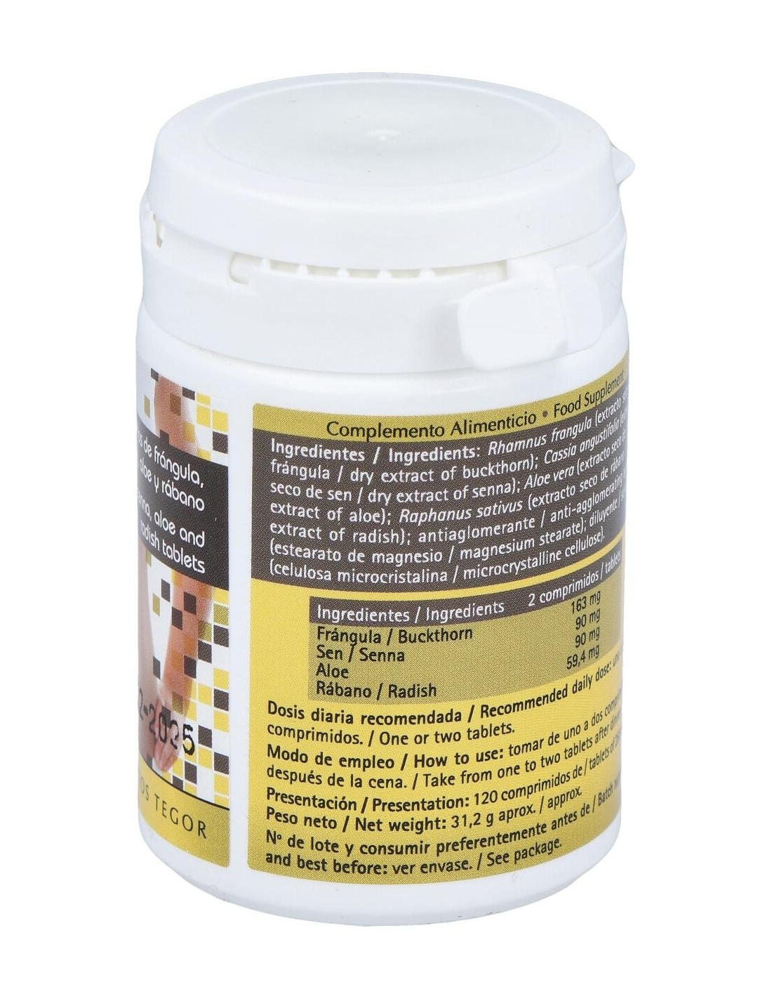Rhamnus frangula (corteza de frángula), 81,50 mg: Cassia angustifolia (hojas de sen), 45 mg: Aloe barbadensis (aloe), 45 mg: Rhaphanus sativus (raíz de rábano), 29,70 mg: excipientes, c.s.p.
