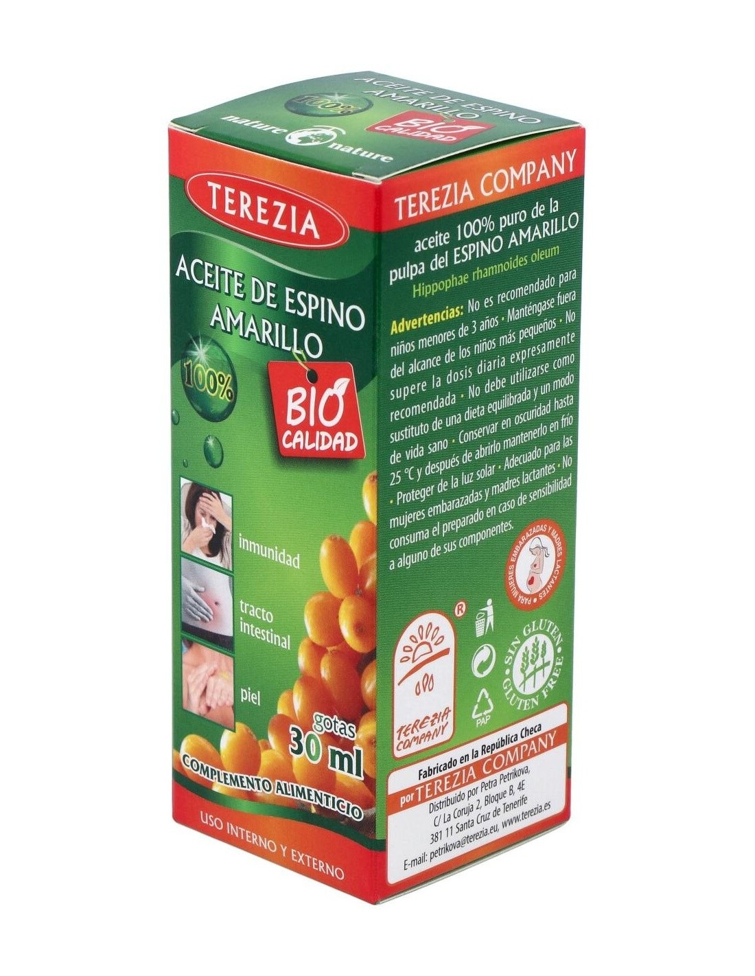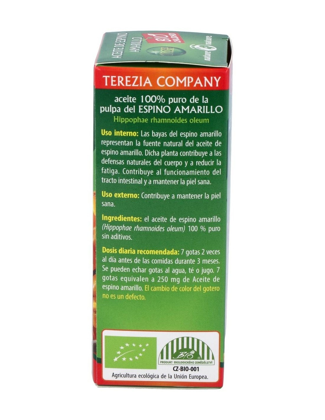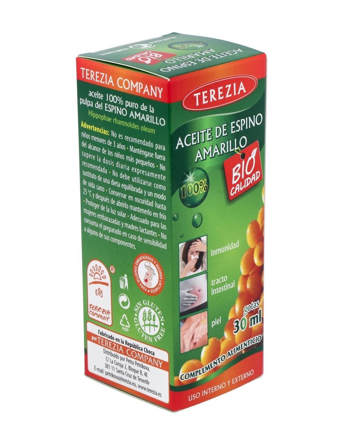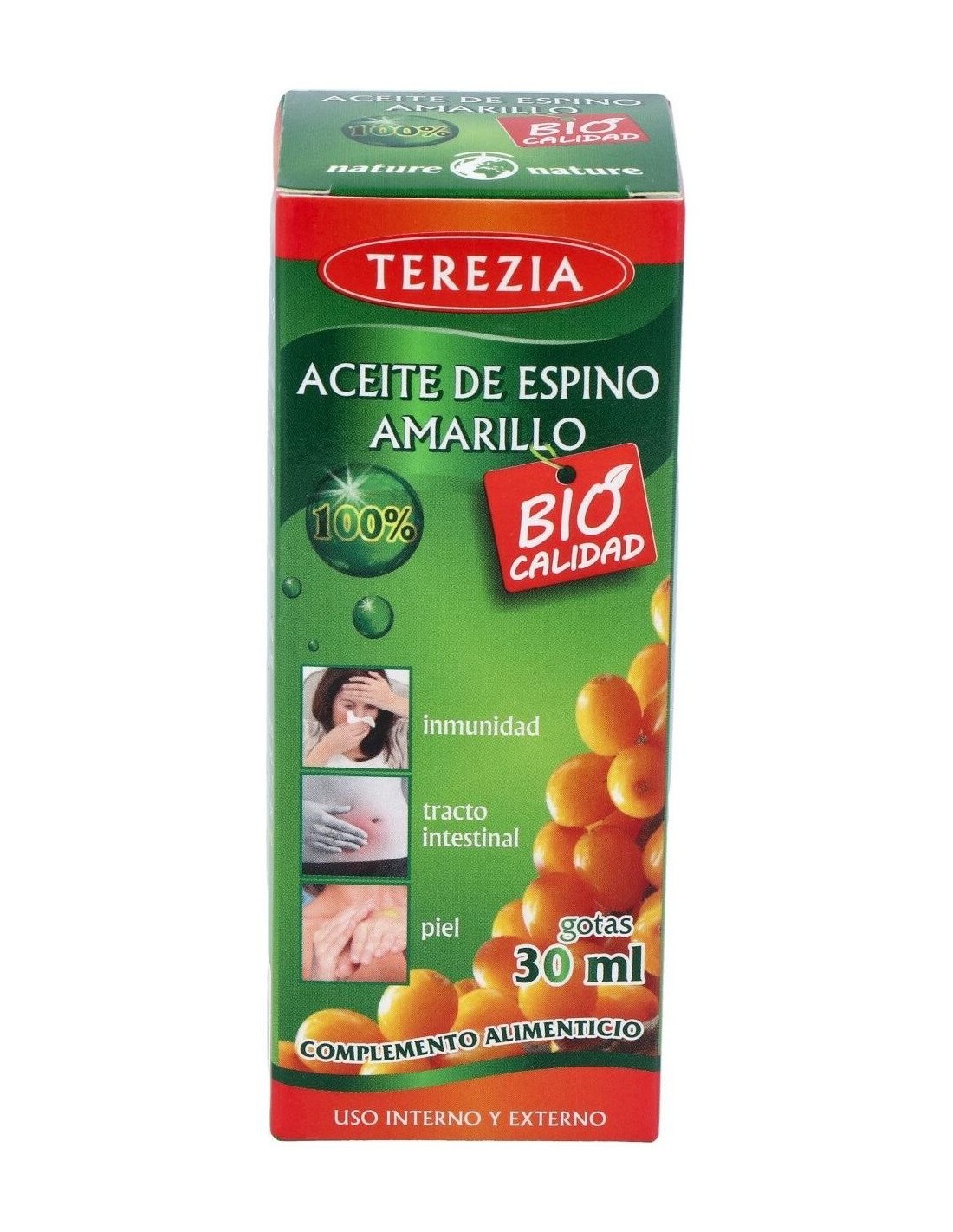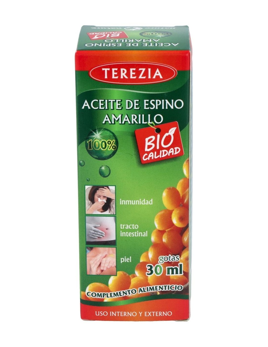 TEREZIAEl aceite de espino amarillo contribuye al normal funcionamiento del sistema inmune, a reducir la fatiga, al funcionamiento normal del tracto intestinal, y a mantener la piel y mucosas en condiciones normales. El aceite de espino amarillo contribuye al normal funcionamiento del sistema inmune, a reducir la fatiga, al funcionamiento normal del tracto intestinal, y a mantener la piel y mucosas en condiciones normales.