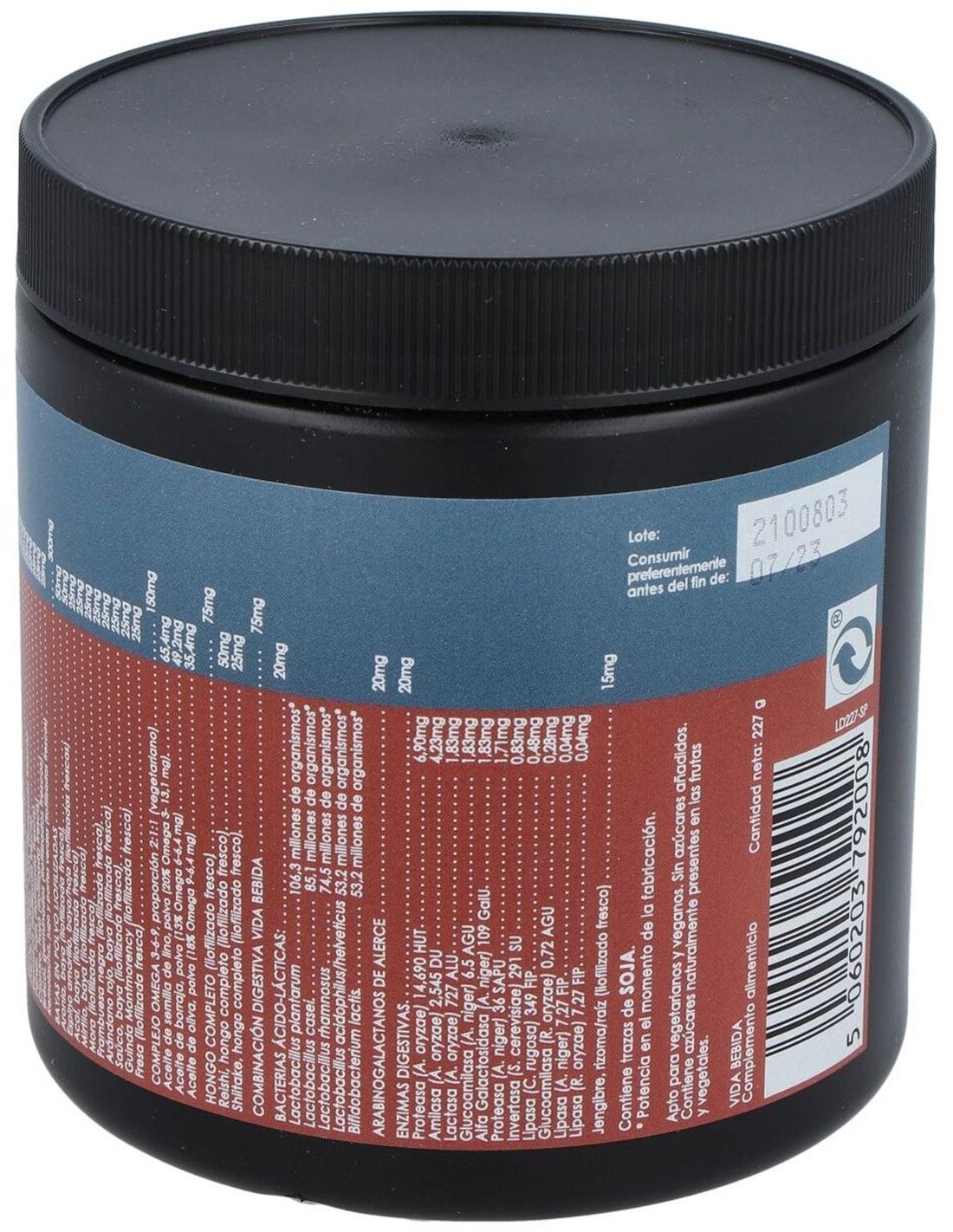 Suplemento a base de proteínas vegetales, activos del salvado de arroz, microalgas, verdes en polvo liofilizados, bayas, hongos, ácidos grasos 3-6-9, enzimas digestivas y bacterias. Apto para vegetarianos y veganos.