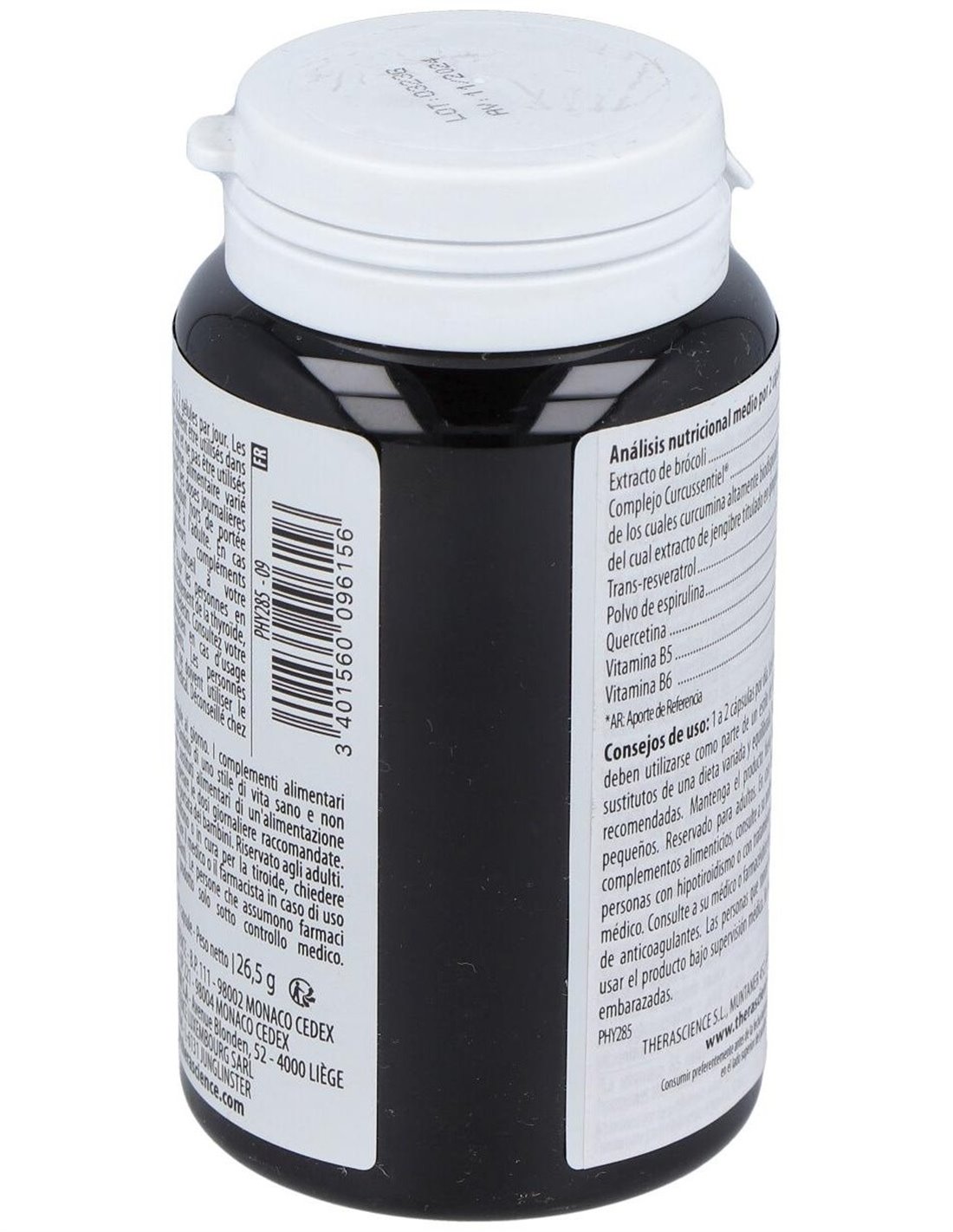 Extracto de semilla de brócoli, túnica de origen vegetal, espirulina en polvo, quercetina, trans-resveratrol, Curcussentiel ® complex (extracto seco de raíz de Curcuma longa L. encapsulado por fibras de fenogreco galactomanano, extracto de rizoma de jengibre titulado en gingeroles), vitamina B5 (pantotenato de calcio D ), vitamina B6 (clorhidrato de piridoxina).