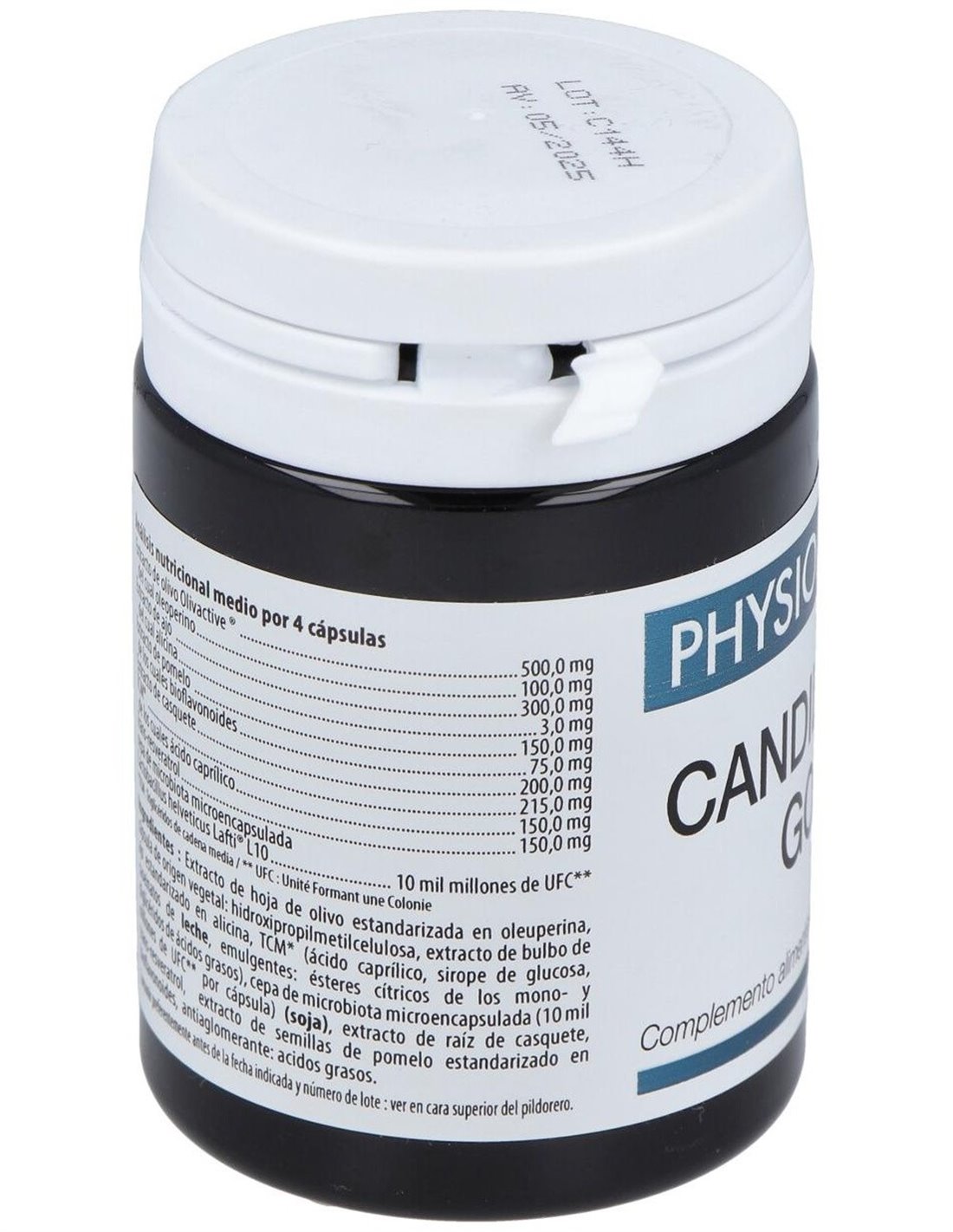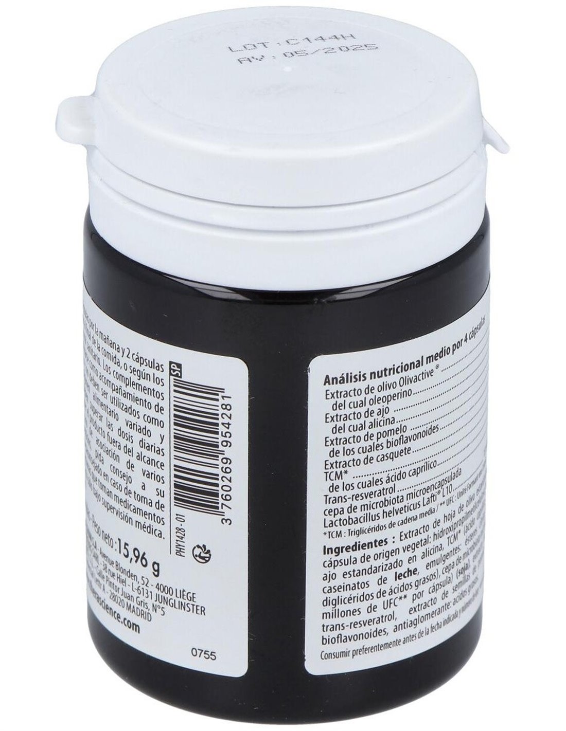 Extracto de hoja de olivo titulado en oleuropeína, recubrimiento de origen vegetal, extracto de bulbo de ajo titulado en alicina, MCT (ácido caprílico, jarabe de glucosa, caseinatos de leche , emulgentes: ésteres de ácido cítrico de monoglicéridos y diglicéridos), cepa de microbiota microencapsulada (10 mil millones UFC por cápsula) ( soja ), extracto de raíz de escutelaria, trans-resveratrol, extracto de semillas de pomelo titulado en bioflavonoides, antiaglomerante: ácidos grasos.