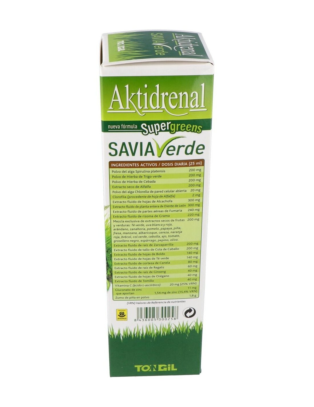 Por 25 ml: Polvo del alga Spirulina platensis (200 mg), Polvo de Hierba de Trigo (200 mg), Polvo de Hierba de Cebada (200 mg), Extracto seco de Alfalfa (200 mg), Polvo del alga Chlorella de pared celular abierta (20 mg), Clorofila (procedente de hoja de Alfalfa) (2 mg), Extracto fluido de hojas de Alcachofa (300 mg), Extracto fluido de planta entera de Diente de León (300 mg), Extracto fluido de partes aéreas de Fumaria (240 mg), Extracto de rizoma de Grama (220 mg), Mezcla exclusiva de extractos secos de frutas y verduras: Té verde, Uva blanca y Roja, Arándano, Zanahoria, Pomelo, Papaya, Piña, Fresa, Manzana, Albaricoque, Cereza, Naranja roja, Brécol, Col verde, Cebolla, Ajo, Tomate, Grosellero negro, Espárrago, Pepino, Olivo (200 mg), Extracto fluido de raíz de Zarzaparrilla (200 mg), Extracto fluido de tallo de Cola de Caballo (200 mg), Extracto fluido de hojas de Boldo (140 mg), Extracto fluido de hojas de Té verde (140 mg), Extracto fluido de corteza de Canela (80 mg), Extracto fluido de raíz de Regaliz (60 mg), Extracto fluido de raíz de Ginseng (40 mg), Extracto fluido de hojas de Orégano (40 mg), Extracto fluido de Tomillo (40 mg), Vitamina C (ácido L-ascórbico) (20 mg), Gluconato de zinc (11 mg): que aportan (1,54 mg) de zinc, Zumo de piña en polvo (1,8 g).