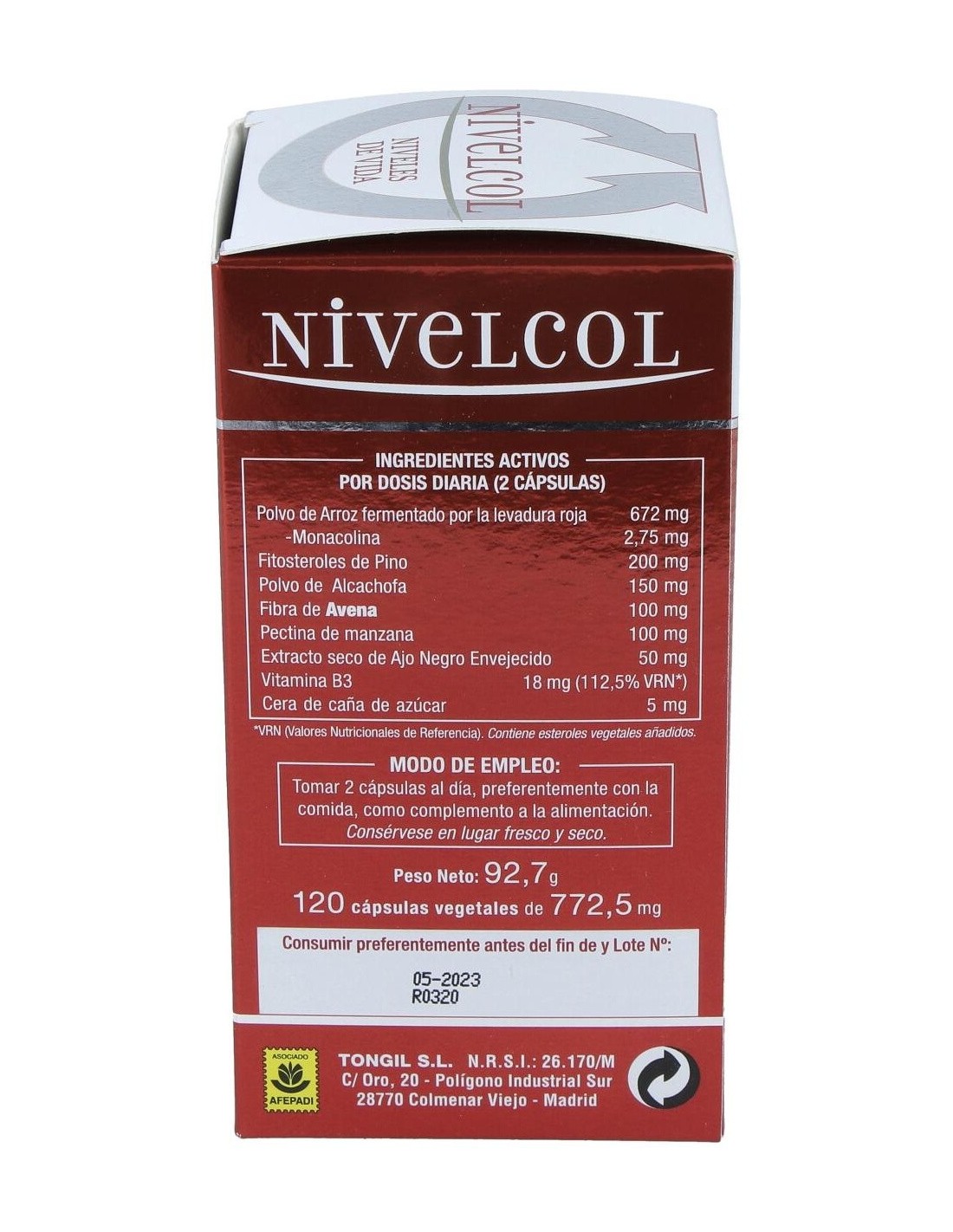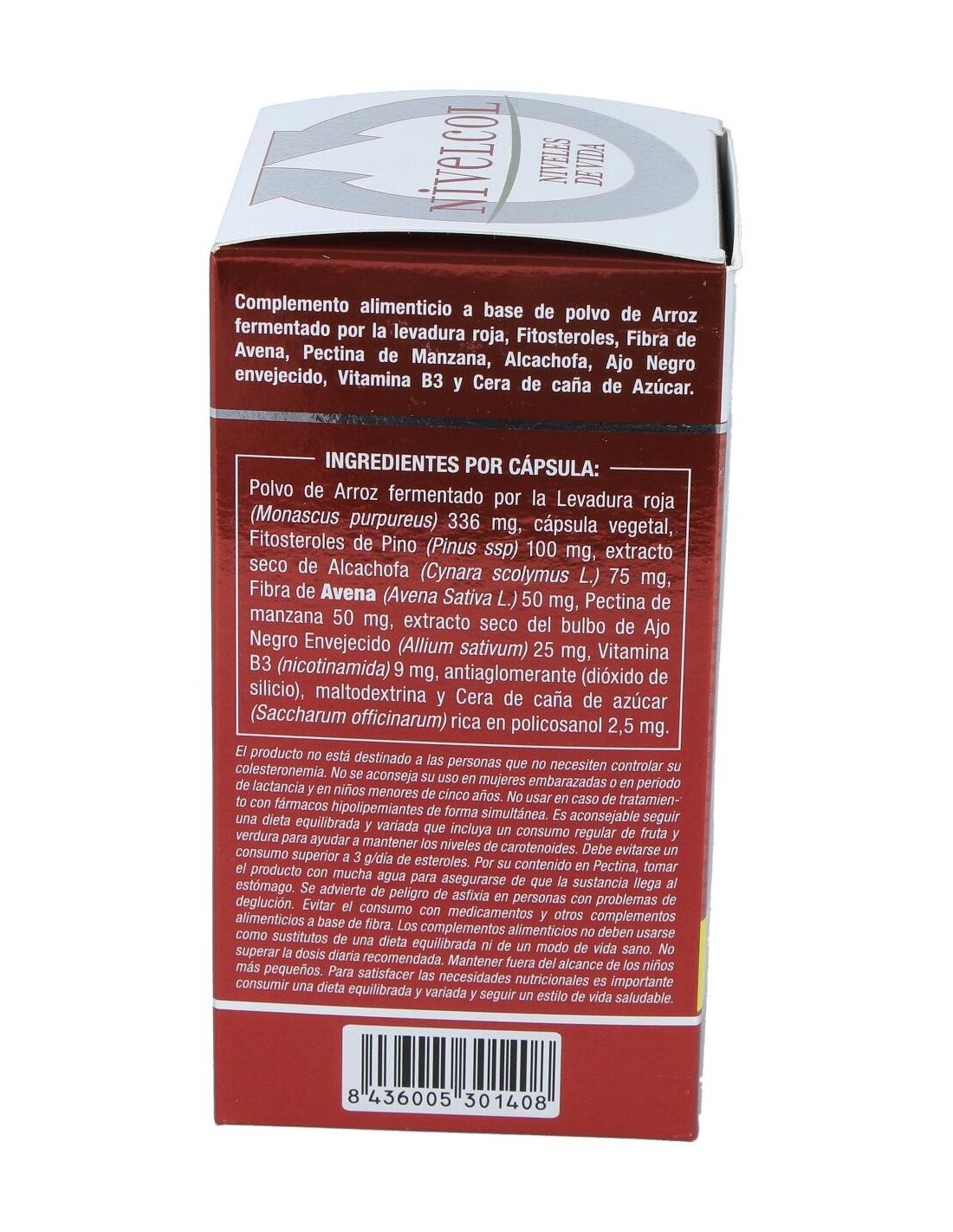 Polvo de arroz fermentado por la levadura roja, cápsula vegetal, fitosteroles de pino, polvo de alpiste, fibra de avena, pectina de manzana, extracto seco de alcachofa, extracto seco de bulbo de ajo negro envejecido, vitamina B3 (nicotinamida), antiaglomerante (dióxido de silicio), diluyente (maltodextrina), cera de caña de azúcar.