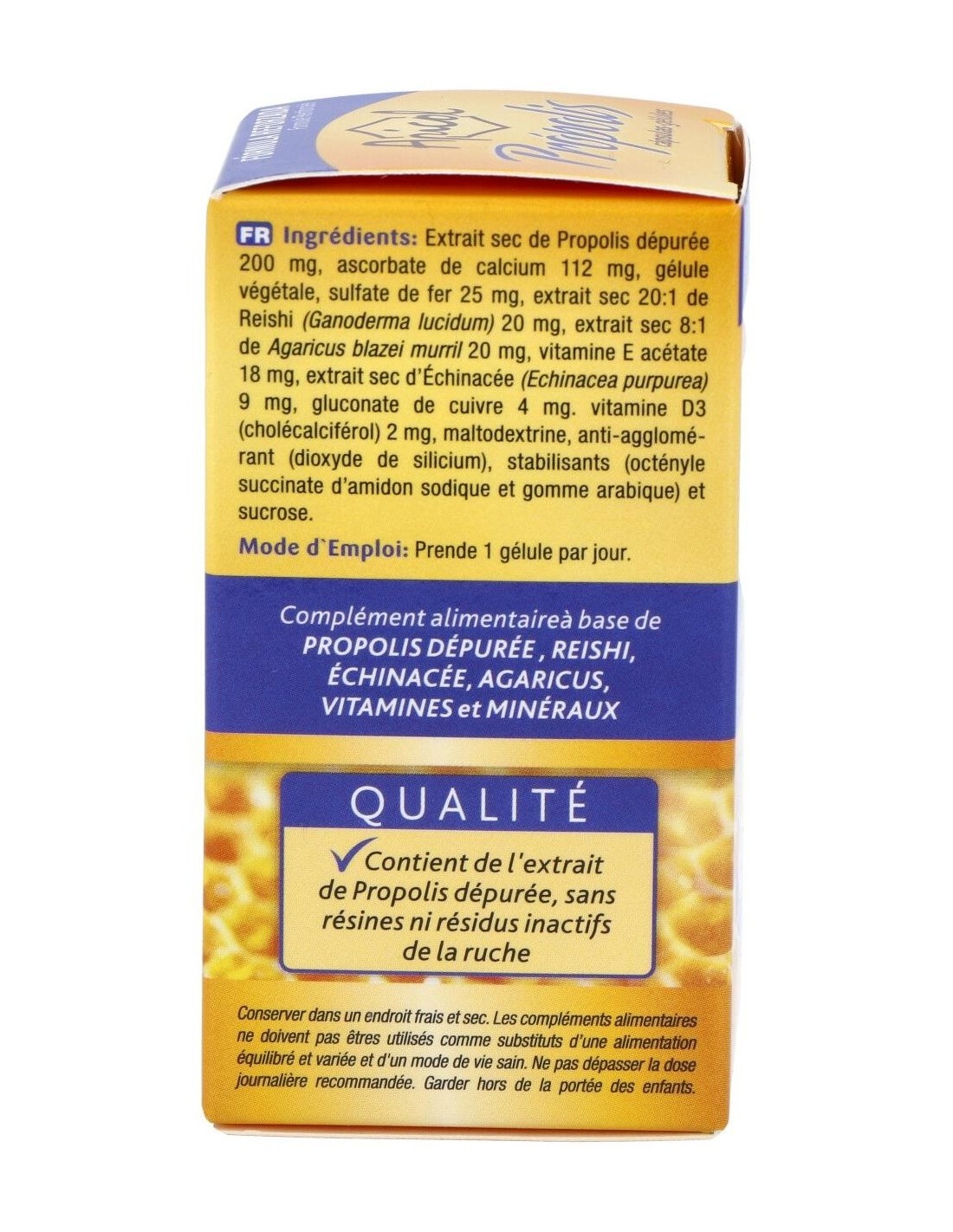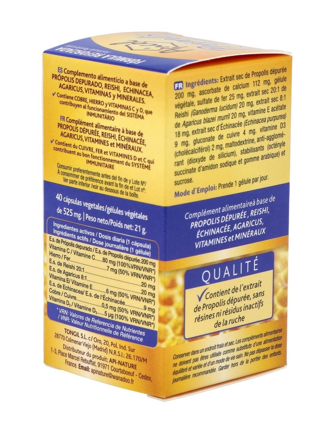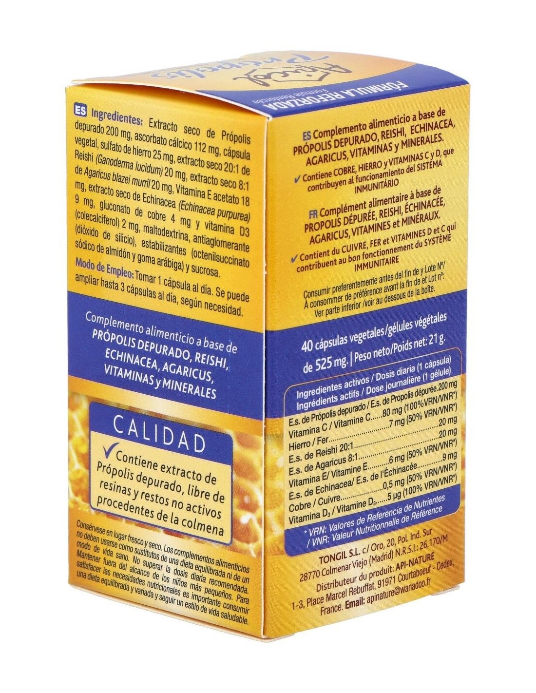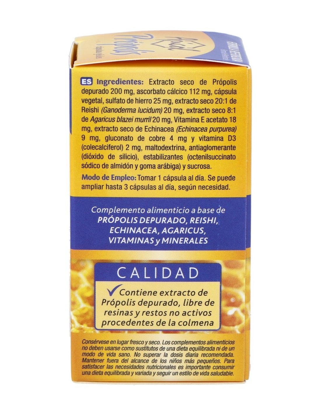 PERLA ENVOLVENTE DE GELATINA, GLICERINA Y AGUA, EXTRACTO SECO DE PROPOLIS DEPURADO (17,9%), SULFATO DE HIERRO (2,54%), EXTRACTO SECO DE REISHI 20:1 (GANODERMA LUCIDUM) (1,91%), VITAMINA E ACETATO (0,48%), EXTRACTO SECO DE ULMARINA (0,86%) Y GLUCONATO DE COBRE (0,38%). ESTABILIZADOR: POLIETILENGLICOL 400.